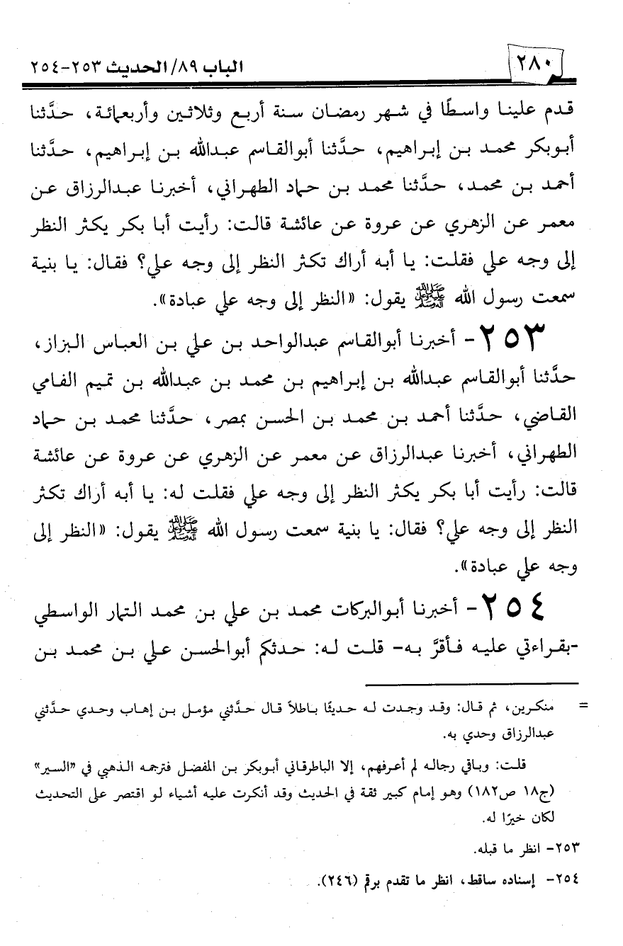 253 - أخبرنا أبو القاسم عبد الواحد بن علي بن العباس البزاز، حدثنا أبو القاسم عبد الله بن إبراهيم بن محمد بن عبد الله بن تميم الفامي القاضي، حدثنا أحمد بن محمد بن الحسن بمصر، حدثنا محمد بن حماد الطهراني، أخبرنا عبد الرزاق عن معمر عن الزهري عن عروة عن عائشة قالت: رأيت أبا بكر يكثر النظر إلى وجه علي فقلت له: يا أبه أراك تكثر النظر إلى وجه علي؟ فقال: يا بنية سمعت رسول الله صلى الله عليه وسلم يقول: ((النظر على وجه علي عبادة)).