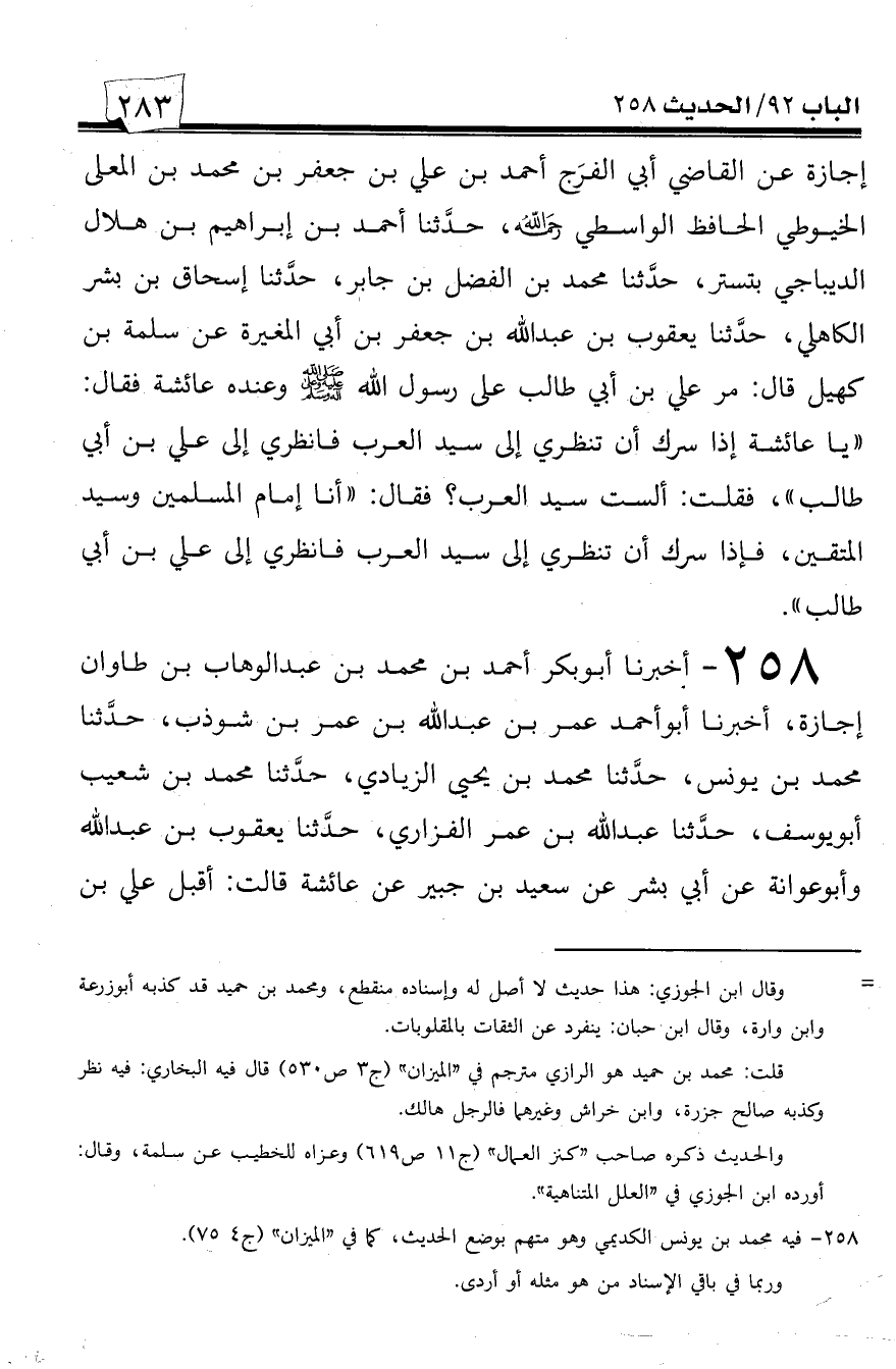 258 - أخبرنا أبو بكر أحمد بن محمد بن عبد الوهاب بن طاوان إجازة، أخبرنا أبو أحمد عمر بن عبد الله بن عمر بن شوذب، حدثنا محمد بن يونس، حدثنا محمد بن يحيى الزيادي، حدثنا محمد بن شعيب أبو يوسف، حدثنا عبد الله بن عمر الفزاري، حدثنا يعقوب بن عبد الله وأبو عوانة عن أبي بشر عن سعيد بن جبير عن عائشة قالت: أقبل علي بن -[284]- أبي طالب فقال النبي صلى الله عليه وسلم: ((من سره أن ينظر إلى سيد شباب العرب فلينظر إلى علي))، فقلت: يا رسول الله ألست سيد شباب العرب؟ قال: ((أنا سيد ولد آدم وعلي سيد شباب العرب)).