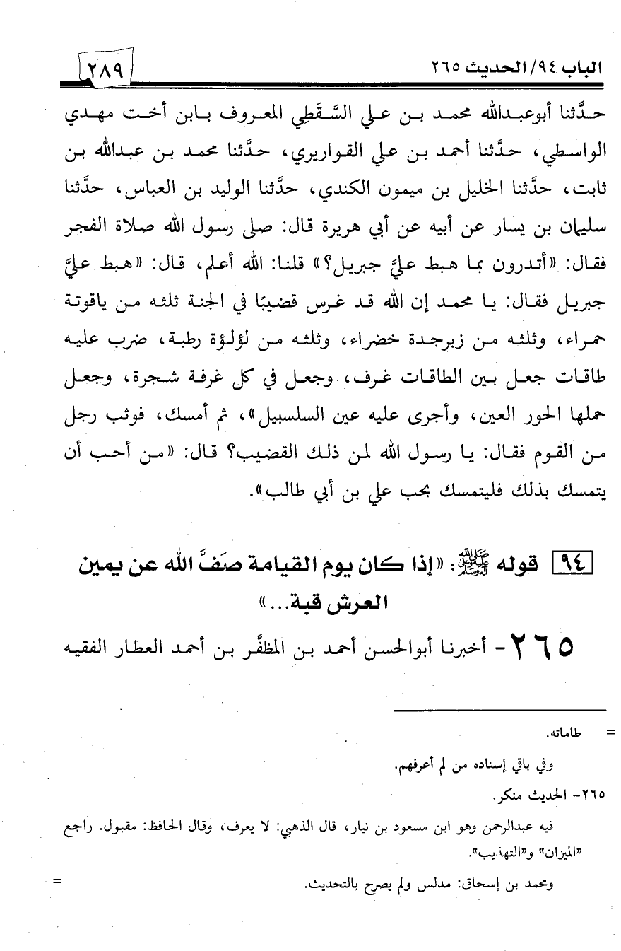 265 - أخبرنا أبو الحسن أحمد بن المظفر بن أحمد العطار الفقيه -[290]- الشافعي -سنة أربع وثلاثين وأربعمائة بقراءتي عليه فأقر به- قلت له: أخبركم أبو محمد عبد الله بن محمد بن عثمان المزني الملقب بابن السقاء الحافظ، حدثنا الهيثم بن خلف، حدثنا أحمد بن محمد بن يزيد حدثني الأشقر، حدثنا جرير بن عبد الحميد عن محمد بن إسحاق عن عبد الرحمن عن سهل بن أبي حثمة عن أبيه قال: قال رسول الله صلى الله عليه وسلم: ((إذا كان يوم -[291]- القيامة صف الله عز وجل لي عن يمين العرش قبة من ذهبة حمراء، وصف لأبي إبراهيم قبة من ذهبة حمراء، وصف لعلي فيما بينهما قبة من ذهبة حمراء، فما ظنك بحبيب بن خليلين)).