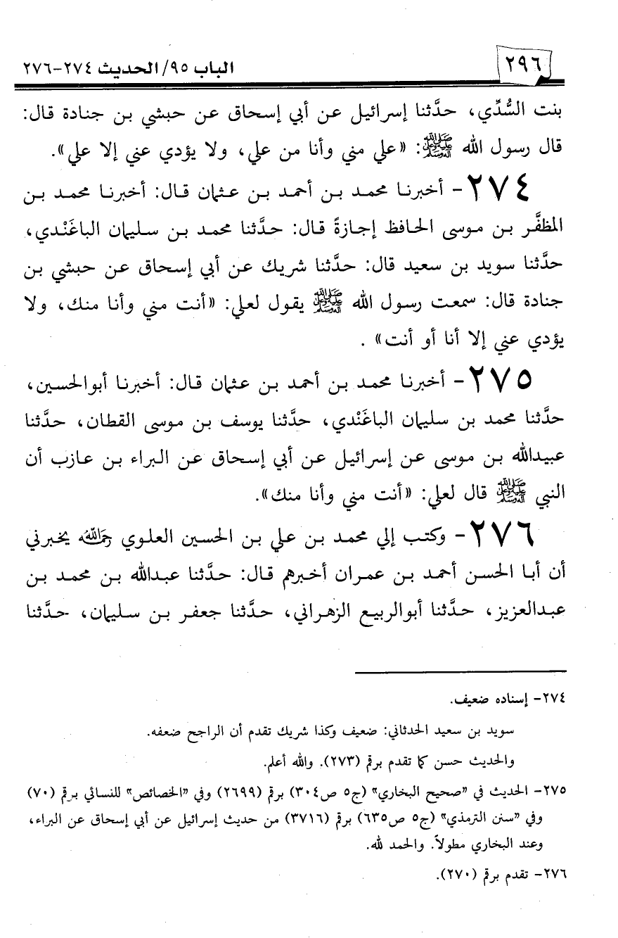 276 - وكتب إلي محمد بن علي بن الحسين العلوي رحمه الله يخبرني أن أبا الحسن أحمد بن عمران أخبرهم قال: حدثنا عبد الله بن محمد بن عبد العزيز، حدثنا أبو الربيع الزهراني، حدثنا جعفر بن سليمان، حدثنا -[297]- يزيد الرشك عن مطرف بن عبد الله عن عمران بن حصين قال: قال رسول الله صلى الله عليه وسلم: ((علي مني وأنا منه، وهو ولي كل مؤمن بعدي)).