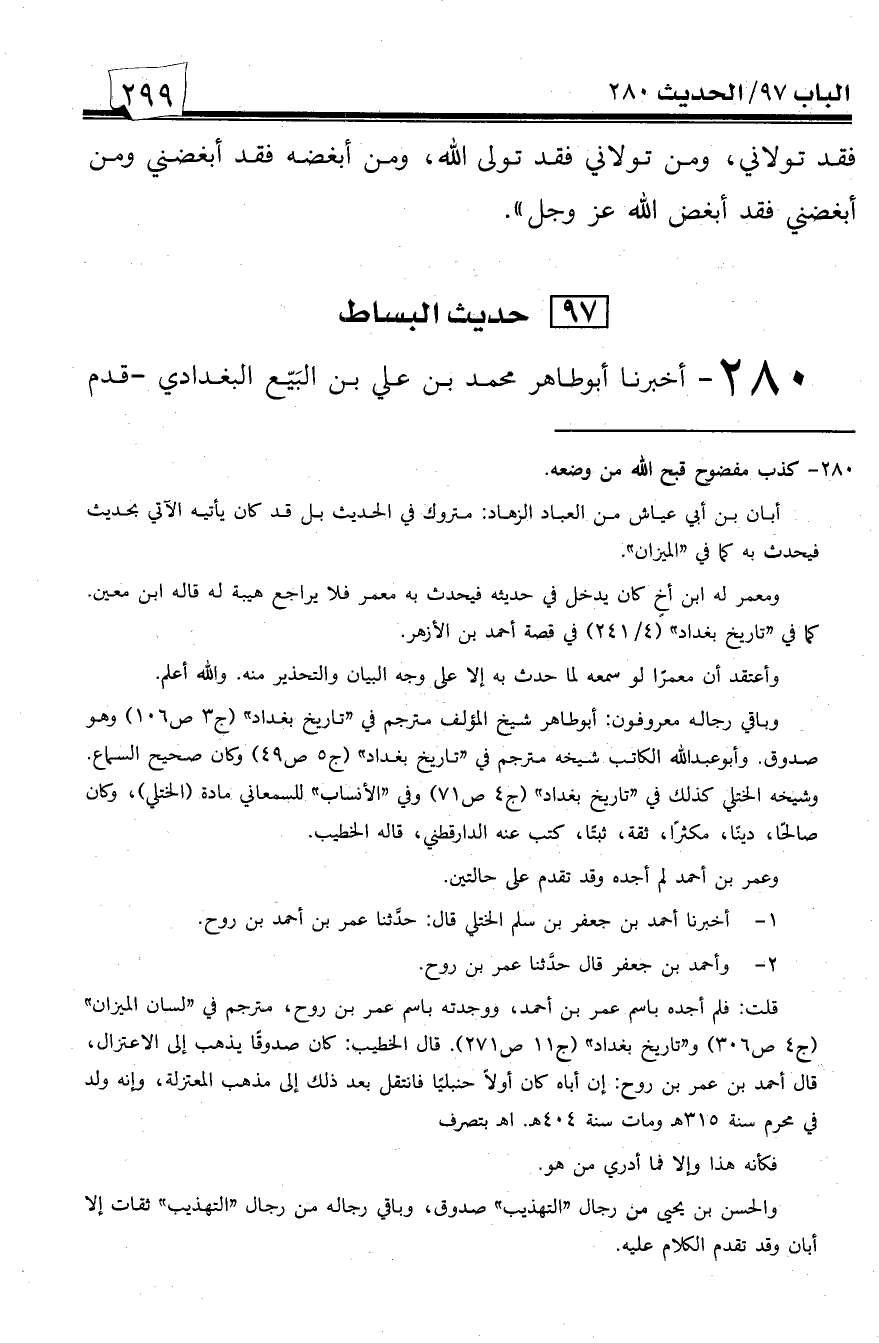 280 - أخبرنا أبو طاهر محمد بن علي بن البيع البغدادي -قدم -[300]- علينا واسطاً-، أخبرنا أبو عبد الله أحمد بن محمد بن عبد الله بن خالد الكاتب، أخبرنا أبو بكر أحمد بن جعفر بن محمد بن سلم الختلي حدثني عمر بن أحمد، حدثنا الحسن بن يحيى أبي الربيع بن الجرجاني، حدثنا عبد الرزاق بن همام الصنعاني، حدثنا معمر عن أبان عن أنس بن مالك قال: أهدي لرسول الله صلى الله عليه وسلم بساطٌ من بهندف فقال لي: ((يا أنس ابسطه))، فبسطته، ثم قال: ((ادع العشرة)) فدعوتهم، فلما دخلوا أمرهم بالجلوس على البساط، ثم دعا علياً فناجاه طويلاً، ثم رجع علي فجلس على البساط، ثم قال: يا ريح احملينا! فحملتنا الريح قال: فإذا البساط يدف بنا دفاً ثم قال: يا ريح ضعينا، ثم قال: تدرون في أي مكان أنتم؟ قلنا: لا، قال: هذا موضع أصحاب الكهف والرقيم، قوموا فسلموا على إخوانكم. قال: فقمنا رجلاً رجلاً فسلمنا عليهم، فلم يردوا علينا، فقام علي بن أبي طالب فقال: السلام عليك معاشر الصديقين والشهداء. قال: فقالوا: عليك السلام ورحمة الله وبركاته. قال: فقلت: ما بالهم ردوا عليك ولم يردوا علينا؟ فقال لهم علي عليه السلام: ما بالكم لم تردوا على إخواني؟ فقالوا: إنا معاشر الصديقين والشهداء لا نكلم بعد الموت إلا نبياً أو وصياً. قال: يا ريح احملينا. فحملتنا تدف بنا دفاً، ثم قال: يا ريح ضعينا. فوضعهم، فإذا نحن بالحرة، قال: فقال علي: ندرك النبي صلى الله عليه وسلم في آخر ركعة. فطوينا، وأتينا، وإذا النبي صلى الله عليه وسلم يقرأ في آخر ركعة: {أم حسبت أن أصحاب الكهف والرقيم كانوا من آياتنا عجباً}.