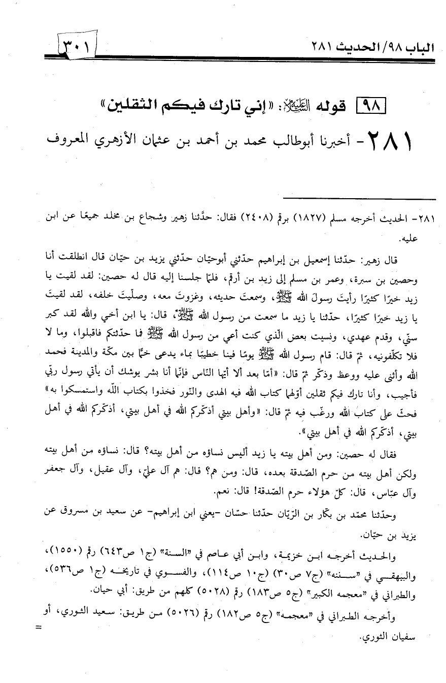 281 - أخبرنا أبو طالب محمد بن أحمد بن عثمان الأزهري المعروف -[303]- بابن الصيرفي البغدادي -قدم علينا واسطاً سنة أربعين وأربعمائة- قال: حدثنا أبو الحسين عبيد الله بن أحمد بن يعقوب بن البواب، حدثنا محمد بن محمد بن سليمان الباغندي، حدثنا وهبان -وهو ابن بقية الواسطي-، حدثنا خالد بن عبد الله عن الحسن بن عبد الله، عن أبي الضحى عن زيد بن أرقيم قال: قال رسول الله صلى الله عليه وسلم: ((إني تاركٌ فيكم الثقلين كتاب الله وعترتي أهل بيتي، وإنهما لن يفترقا حتى يردا علي الحوض)).