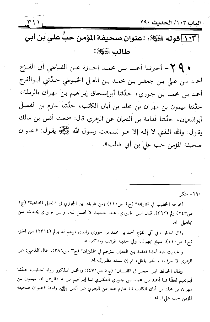 290 - أخبرنا أحمد بن محمد إجازة عن القاضي أبي الفرج أحمد بن علي بن جعفر بن محمد بن المعلى الخيوطي حدثني أبو الفرج أحمد بن محمد بن جوري، حدثنا أبو إسحاق إبراهيم بن مهران بالرملة، حدثنا ميمون بن مهران بن مخلد بن أبان الكاتب، حدثنا عارم بن الفضل أبو النعمان، حدثنا قدامة بن النعمان عن الزهري قال: سمعت أنس بن مالك يقول: والله الذي لا إله إلا هو لسمعت رسول الله صلى الله عليه وسلم يقول: ((عنوان صحيفة المؤمن حب علي بن أبي طالب)).