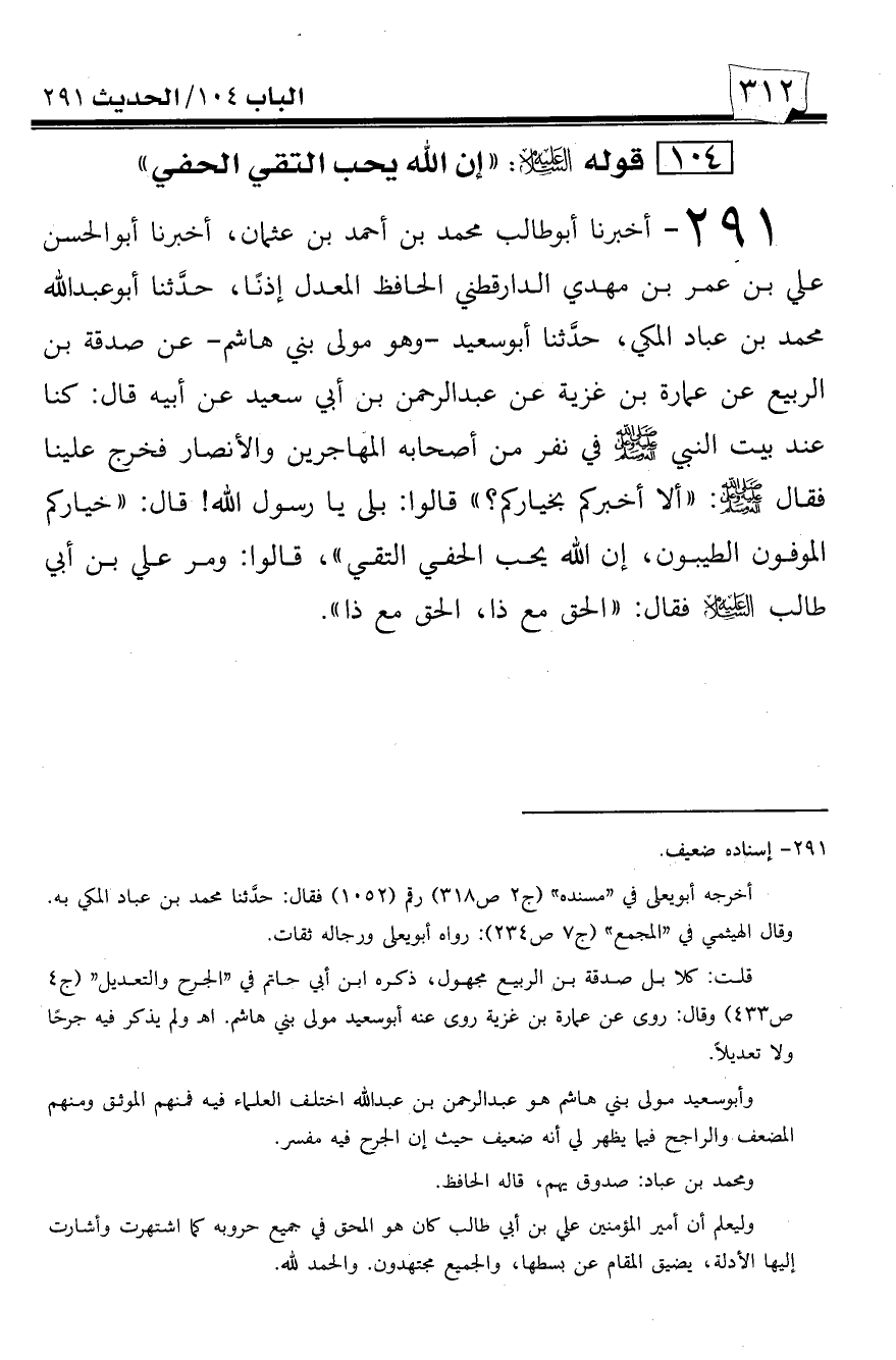 291 - أخبرنا أبو طالب محمد بن أحمد بن عثمان، أخبرنا أبو الحسن علي بن عمر بن مهدي الدارقطني الحافظ المعدل إذناً، حدثنا أبو عبد الله محمد بن عباد المكي، حدثنا أبو سعيد -وهو مولى بني هاشم- عن صدقة بن الربيع عن عمارة بن غزية عن عبد الرحمن بن أبي سعيد عن أبيه قال: كنا عند بيت النبي صلى الله عليه وسلم في نفر من أصحابه المهاجرين والأنصار فخرج علينا فقال صلى الله عليه وسلم: ((ألا أخبركم بخياركم؟)) قالوا: بلى يا رسول الله! قال: ((خياركم الموفون الطيبون، إن الله يحب الحفي التقي))، قالوا: ومر علي بن أبي طالب عليه السلام فقال: ((الحق مع ذا، الحق مع ذا)).