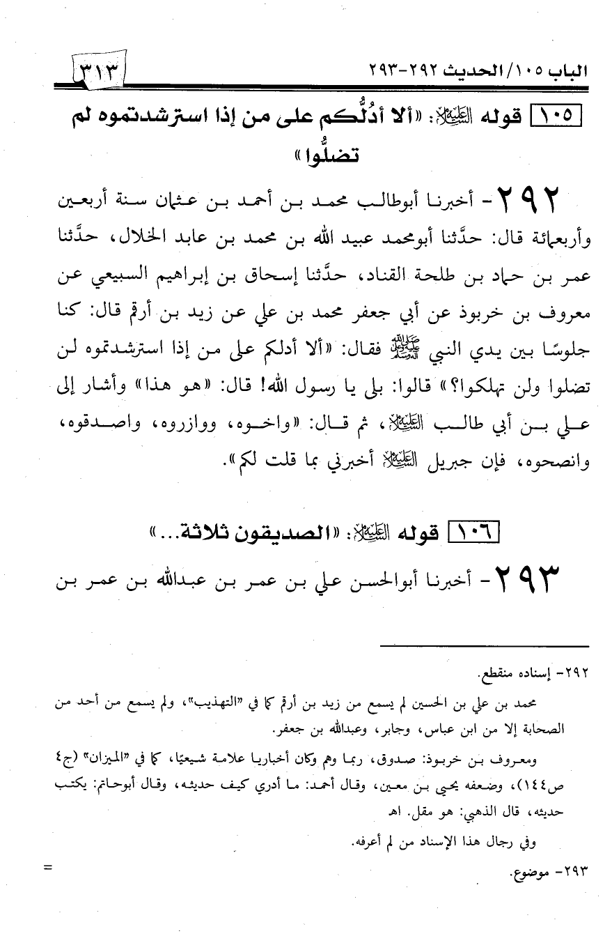 292 - أخبرنا أبو طالب محمد بن أحمد بن عثمان سنة أربعين وأربعمائة قال: حدثنا أبو محمد عبيد الله بن محمد بن عابد الخلال، حدثنا عمر بن حماد بن طلحة القناد، حدثنا إسحاق بن إبراهيم السبيعي عن معروف بن خربوذ عن أبي جعفر محمد بن علي عن زيد بن أرقم قال: كنا جلوساً بين يدي النبي صلى الله عليه وسلم فقال: ((ألا أدلكم على من إذا استرشدتموه لن تضلوا ولن تهلكوا؟)) قالوا: بلى يا رسول الله! قال: ((هو هذا)) وأشار إلى علي بن أبي طالب عليه السلام، ثم قال: ((واخوه، ووازروه، واصدقوه، وانصحوه، فإن جبريل عليه السلام أخبرني بما قلت لكم)).