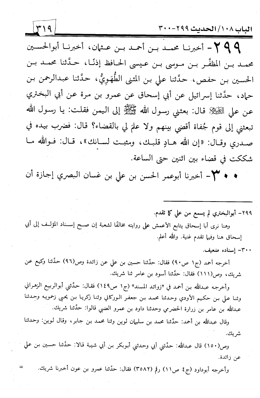 299 - أخبرنا محمد بن أحمد بن عثمان، أخبرنا أبو الحسين محمد بن المظفر بن موسى بن عيسى الحافظ إذناً، حدثنا محمد بن الحسين بن حفص، حدثنا علي بن المثنى الطهوي، حدثنا عبد الرحمن بن حماد، حدثنا إسرائيل عن أبي إسحاق عن عمرو بن مرة عن أبي البختري عن علي عليه السلام قال: بعثني رسول الله صلى الله عليه وسلم إلى اليمن فقلت: يا رسول الله تبعثني إلى قوم جفاة أقضي بينهم ولا علم لي بالقضاء؟ قال: فضرب بيده في صدري وقال: ((إن الله هادٍ قلبك، ومثبت لسانك))، قال: فوالله ما شككت في قضاء بين اثنين حتى الساعة.