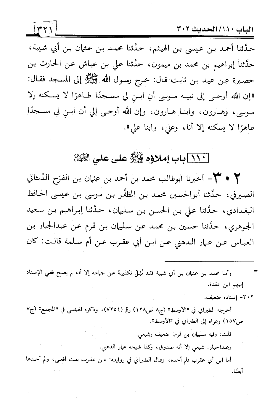 302 - أخبرنا أبو طالب محمد بن أحمد بن عثمان بن الفرج الدبثائي الصيرفي، حدثنا أبو الحسين محمد بن المظفر بن موسى بن عيسى الحافظ البغدادي، حدثنا علي بن الحسن بن سليمان، حدثنا إبراهيم بن سعيد الجوهري، حدثنا حسين بن محمد عن سليمان بن قرم عن عبد الجبار بن العباس عن عمار الدهني عن ابن أبي عقرب عن أم سلمة قالت: كان -[322]- جبريل يملي على رسول الله صلى الله عليه وسلم، ورسول الله يملي على علي.