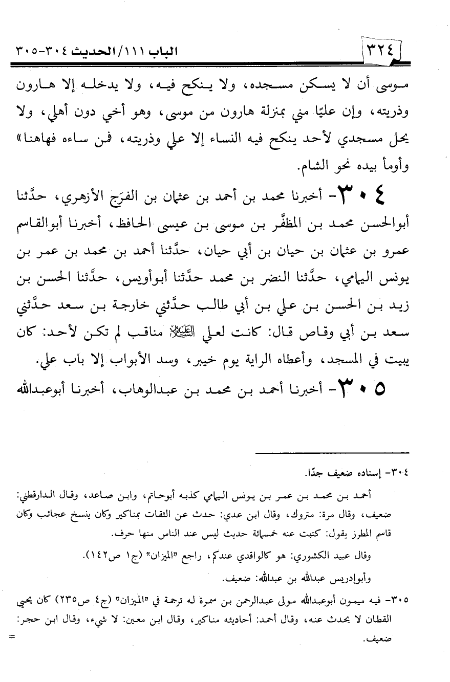 304 - أخبرنا محمد بن أحمد بن عثمان بن الفرج الأزهري، حدثنا أبو الحسن محمد بن المظفر بن موسى بن عيسى الحافظ، أخبرنا أبو القاسم عمرو بن عثمان بن حيان بن أبي حيان، حدثنا أحمد بن محمد بن عمر بن يونس اليمامي، حدثنا النضر بن محمد حدثنا أبو أويس، حدثنا الحسن بن زيد بن الحسن بن علي بن أبي طالب حدثني خارجة بن سعد حدثني سعد بن أبي وقاص قال: كانت لعلي عليه السلام مناقب لم تكن لأحد: كان يبيت في المسجد، وأعطاه الراية يوم خيبر، وسد الأبواب إلا باب علي.