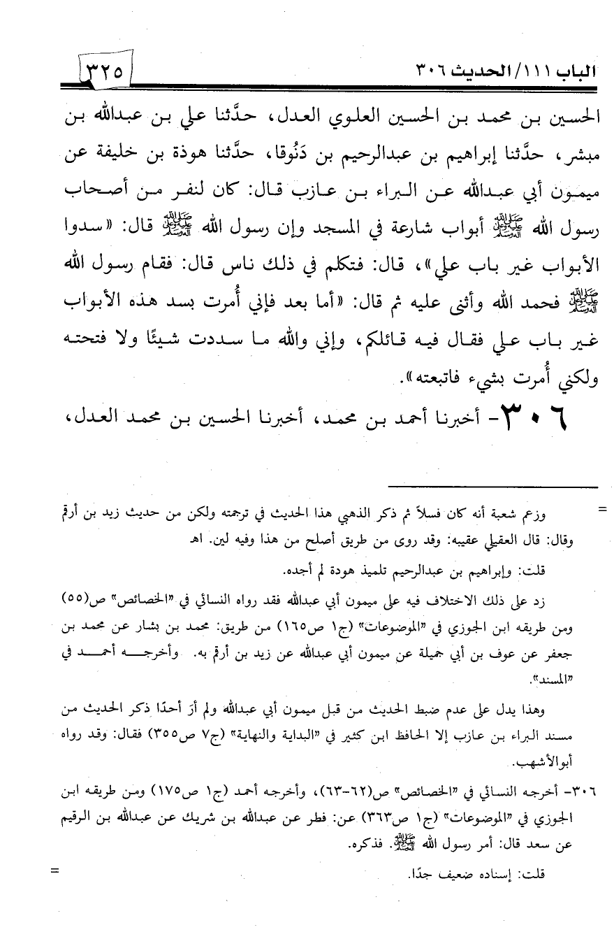 306 - أخبرنا أحمد بن محمد، أخبرنا الحسين بن محمد العدل، -[326]- حدثنا محمد بن محمود، حدثنا الحسين بن سلام السواق، حدثنا عبيد الله بن موسى، حدثنا فطر بن خليفة عن عبد الله بن شريك عن عبد الله بن الرقيم عن سعد أن النبي صلى الله عليه وسلم أمر بسد الأبواب فسدت وترك باب علي فأتاه العباس فقال: يا رسول الله سددت أبوابنا وتركت باب علي! قال: ((ما أنا فتحتها ولا أنا سددتها)).