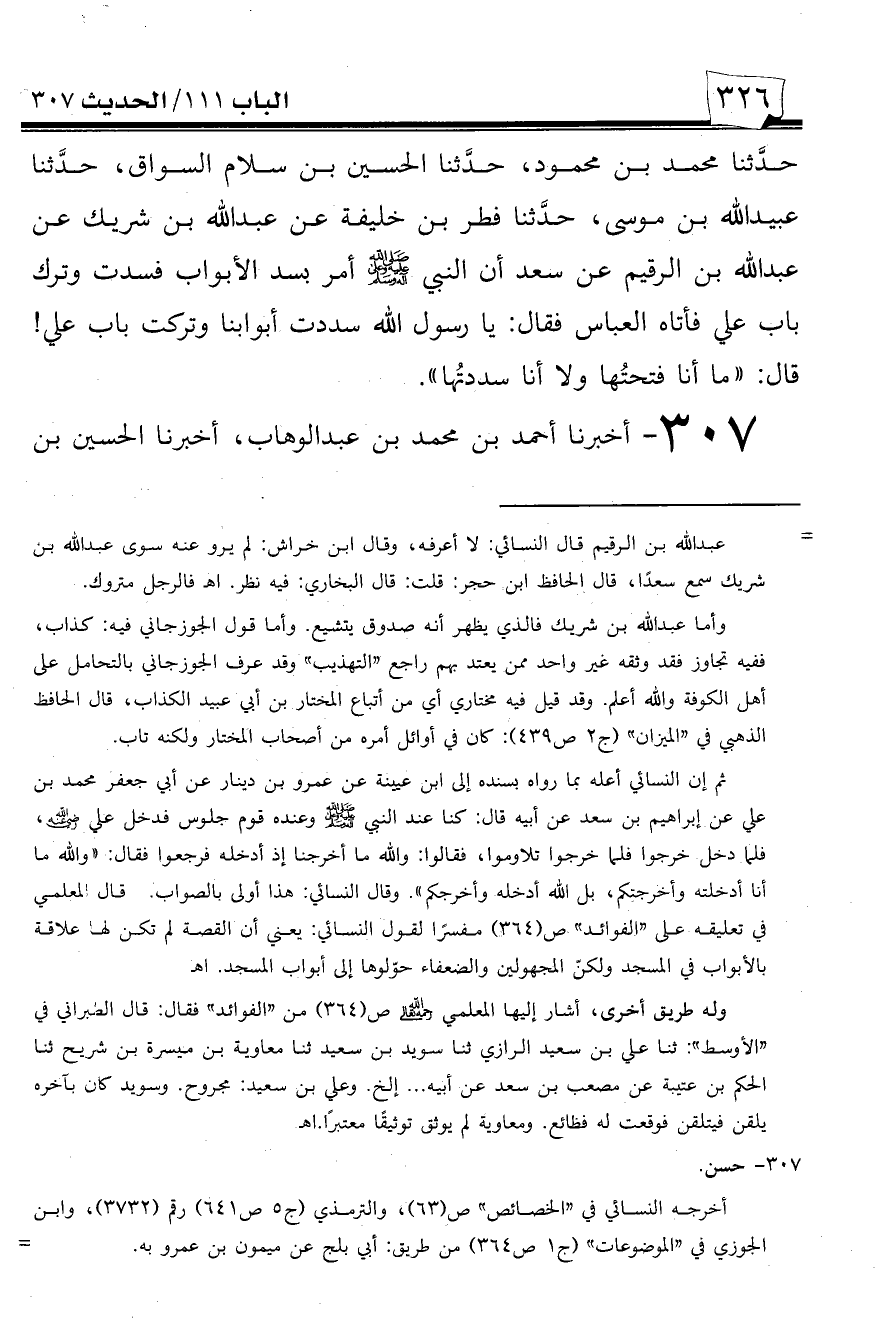 307 - أخبرنا أحمد بن محمد بن عبد الوهاب، أخبرنا الحسين بن -[327]- محمد العدل، حدثنا أحمد بن عيسى بن السكين البلدي، حدثنا الرمادي، حدثنا يحيى بن حماد، حدثنا أبو عوانة، حدثنا أبو بلج، حدثنا عمرو بن ميمون عن ابن عباس أن النبي صلى الله عليه وسلم سد أبواب المسجد غير باب علي.