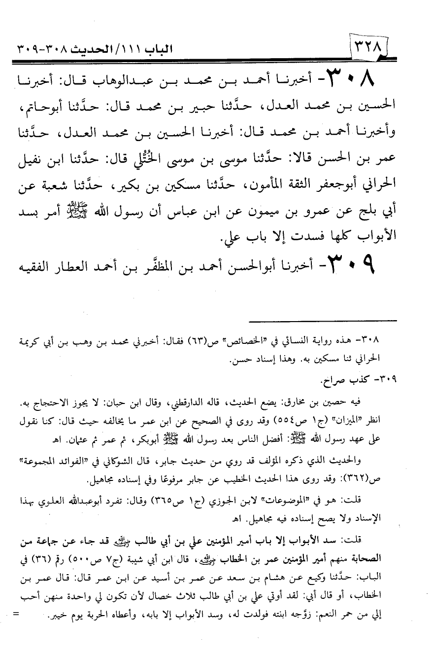 308 - أخبرنا أحمد بن محمد بن عبد الوهاب قال: أخبرنا الحسين بن محمد العدل، حدثنا حبير بن محمد قال: حدثنا أبو حاتم، وأخبرنا أحمد بن محمد قال: أخبرنا الحسين بن محمد العدل، حدثنا عمر بن الحسن قالا: حدثنا موسى بن موسى الختلي قال: حدثنا ابن نفيل الحراني أبو جعفر الثقة المأمون، حدثنا مسكين بن بكير، حدثنا شعبة عن أبي بلج عن عمرو بن ميمون عن ابن عباس أن رسول الله صلى الله عليه وسلم أمر بسد الأبواب كلها فسدت إلا باب علي.
