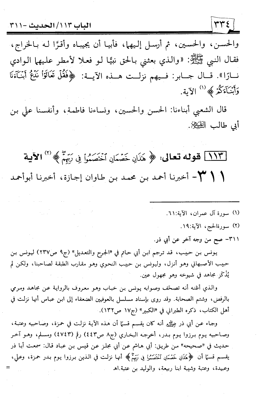 311 - أخبرنا أحمد بن محمد بن طاوان إجازة، أخبرنا أبو أحمد -[335]- عمر بن عبد الله بن شوذب، حدثنا محمد بن جعفر، حدثنا محمد بن بشر الأرطباني، حدثنا أبو حاتم السجستاني، حدثنا أبو عبيدة، حدثنا يونس بن حبيب قال: سألت مجاهداً فقال: سألت ابن عباس فقال: نزلت هذه الثلاث الآيات بالمدينة {هذان خصمان اختصموا في ربهم}، في حمزة، وعبيدة، وعلي، وعتبة وشيبة، والوليد.