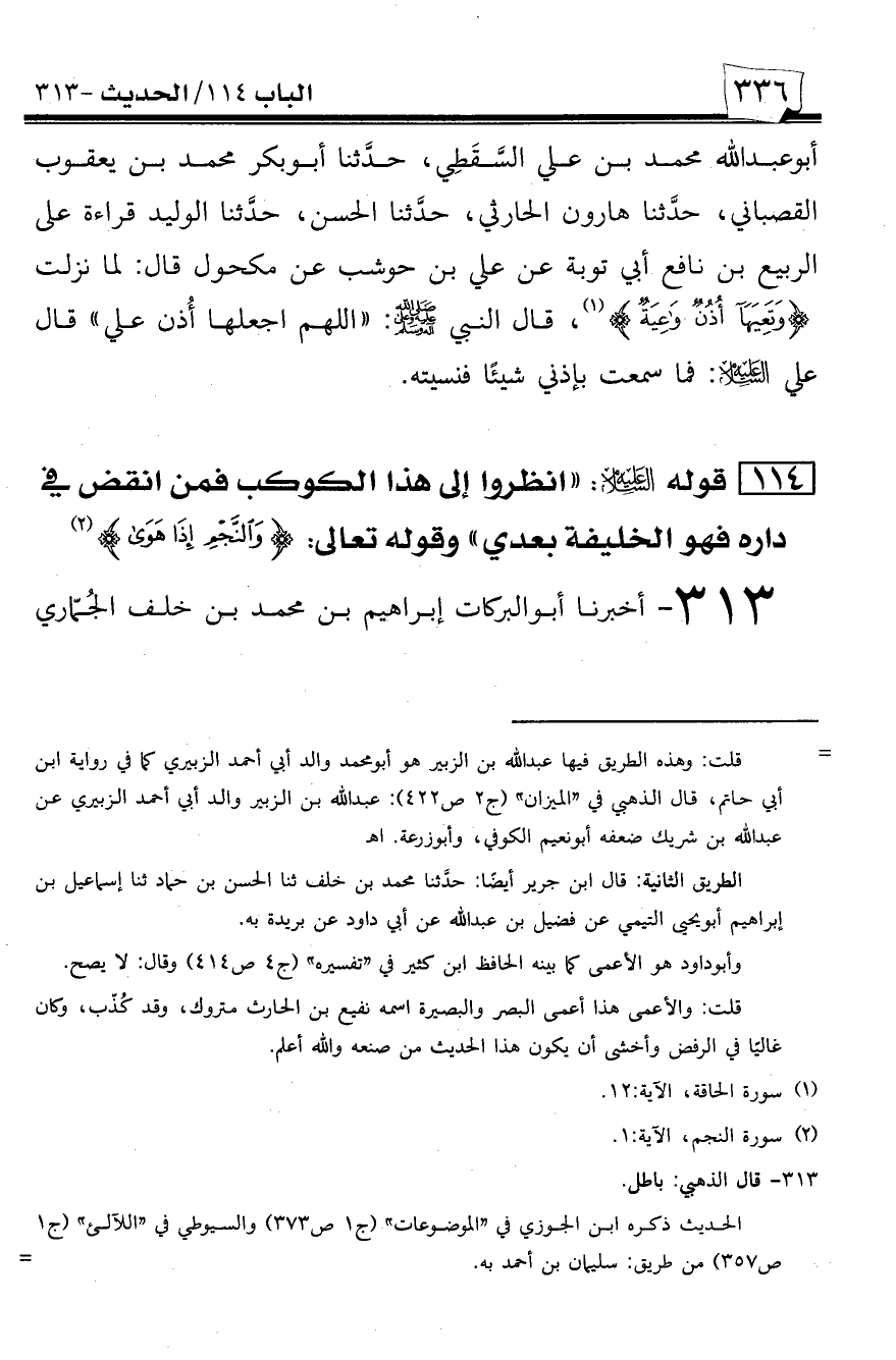 313 - أخبرنا أبو البركات إبراهيم بن محمد بن خلف الجماري -[337]- السقطي، أخبرنا أبو عبد الله الحسين بن أحمد، حدثنا أبو الفتح أحمد بن الحسن بن سهل المالكي المصري الواعظ بواسط في القراطيسيين، حدثنا سليمان بن أحمد المالكي قال: حدثنا أبو قضاعة ربيعة بن محمد الطائي، حدثنا ثوبان ذي النون، حدثنا مالك بن غسان النهشلي، حدثنا ثابت عن أنس قال: انقض كوكبٌ على عهد رسول الله! فقال رسول الله صلى الله عليه وسلم: ((انظروا إلى هذا الكوكب فمن انقض في داره فهو الخليفة من بعدي))، فنظروا فإذا هو -[338]- قد انقض في منزل علي! فأنزل الله تعالى: {والنجم إذا هوى. ما ضل صاحبكم وما غوى. وما ينطق عن الهوى. إن هو إلا وحي يوحى}.