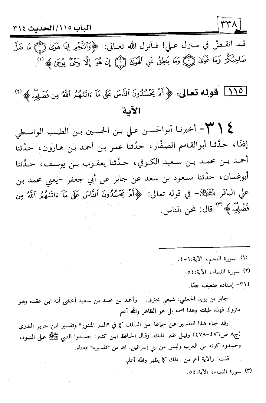 314 - أخبرنا أبو الحسن علي بن الحسين بن الطيب الواسطي إذناً، حدثنا أبو القاسم الصفار، حدثنا عمر بن أحمد بن هارون، حدثنا أحمد بن محمد بن سعيد الكوفي، حدثنا يعقوب بن يوسف، حدثنا أبو غسان، حدثنا مسعود بن سعد عن جابر عن أبي جعفر -يعني محمد بن علي الباقر عليه السلام- في قوله تعالى: {أم يحسدون الناس على ما آتاهم الله من فضله} قال: نحن الناس.