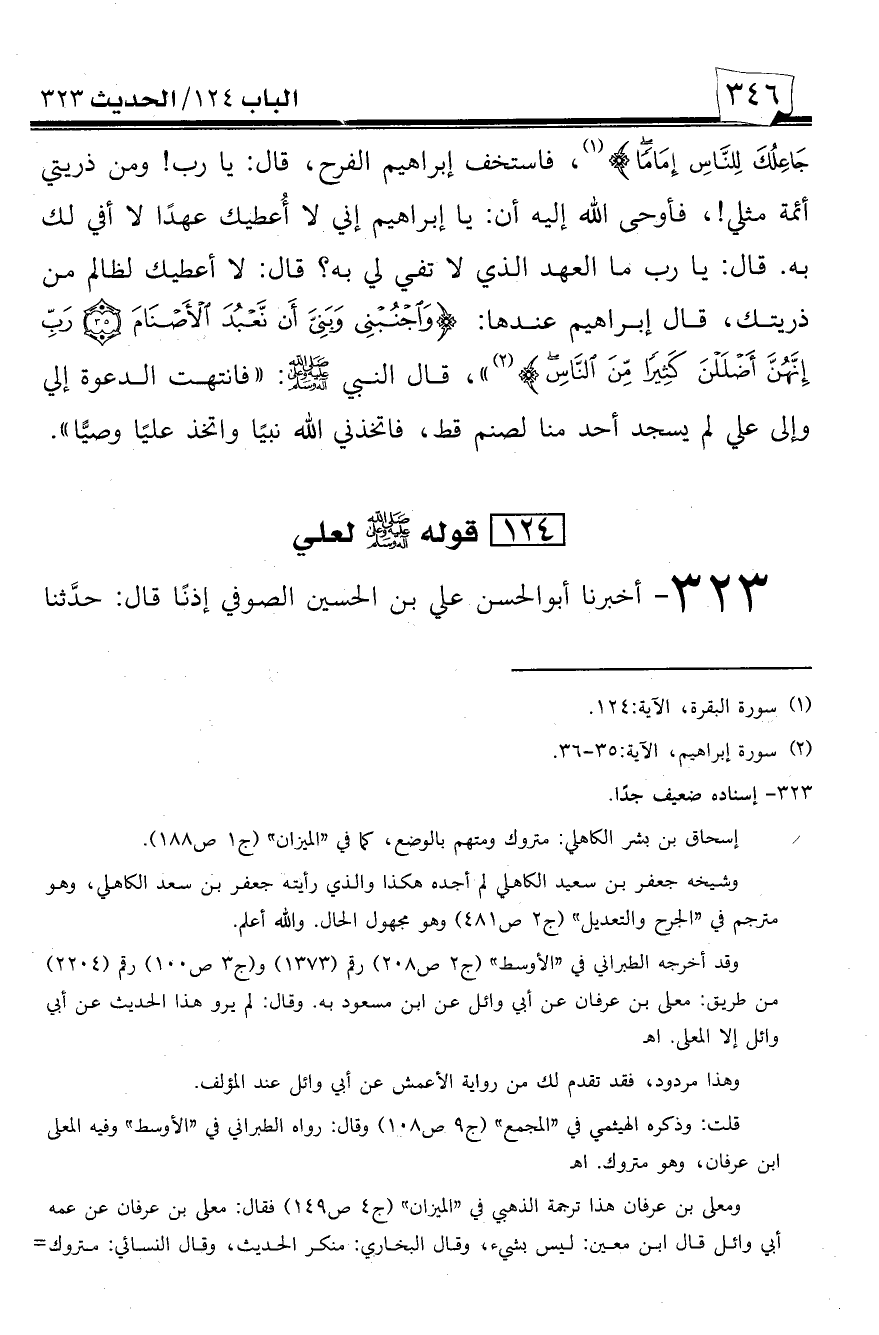 323 - أخبرنا أبو الحسن علي بن الحسين الصوفي إذناً قال: حدثنا -[347]- أبو عبد الله محمد بن علي السقطي، حدثنا محمد بن الحسين الزعفراني قال: حدثنا أحمد بن القاسم بن مساور قال: حدثنا إسحاق بن بشر قال: حدثنا جعفر بن سعيد الكاهلي عن الأعمش عن أبي وائل عن عبد الله بن مسعود قال: رأيت رسول الله صلى الله عليه وسلم آخذاً بيد علي وهو يقول: ((هذا وليي وأنا وليه، سالمت من سالم، وعاديت من عادى)).