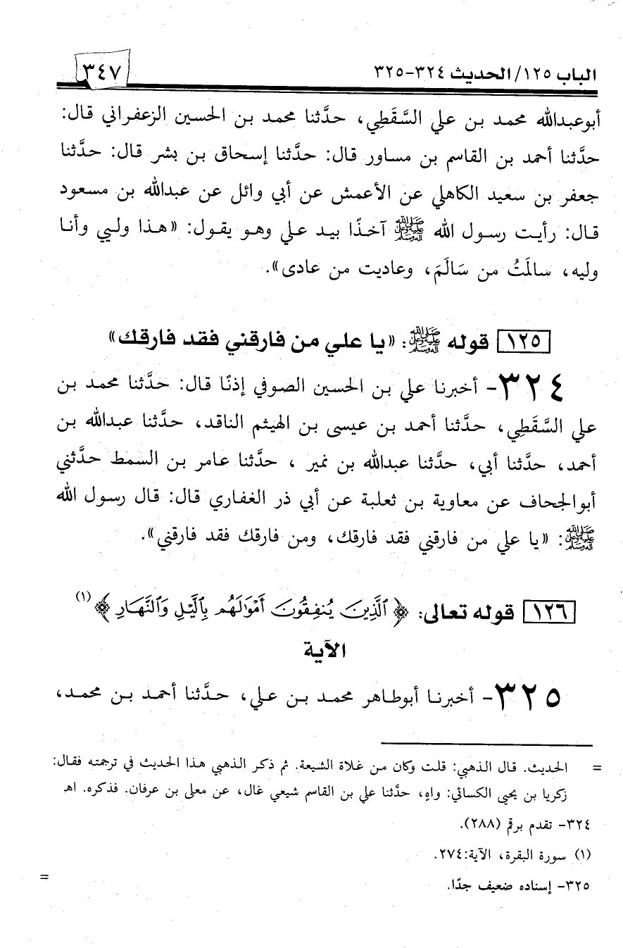 324 - أخبرنا علي بن الحسين الصوفي إذناً قال: حدثنا محمد بن علي السقطي، حدثنا أحمد بن عيسى بن الهيثم الناقد، حدثنا عبد الله بن أحمد، حدثنا أبي، حدثنا عبد الله بن نمير، حدثنا عامر بن السمط حدثني أبو الجحاف عن معاوية بن ثعلبة عن أبي ذر الغفاري قال: قال رسول الله صلى الله عليه وسلم: ((يا علي من فارقني فقد فارقك، ومن فارقك فقد فارقني)).