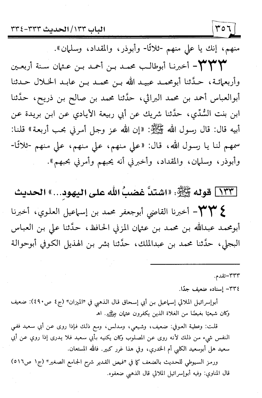 334 - أخبرنا القاضي أبو جعفر محمد بن إسماعيل العلوي، أخبرنا أبو محمد عبد الله بن محمد بن عثمان المزني الحافظ، حدثنا علي بن العباس البجلي، حدثنا محمد بن عبد الملك، حدثنا بشر بن الهذيل الكوفي أبو حوالة -[357]- حدثني أبو إسرائيل عن عطية العوفي عن أبي سعيد الخدري قال: قال رسول الله صلى الله عليه وسلم: ((أشتد غضب الله على اليهود، واشتد غضب الله على النصارى واشتد غضب الله على من آذاني في عترتي)).