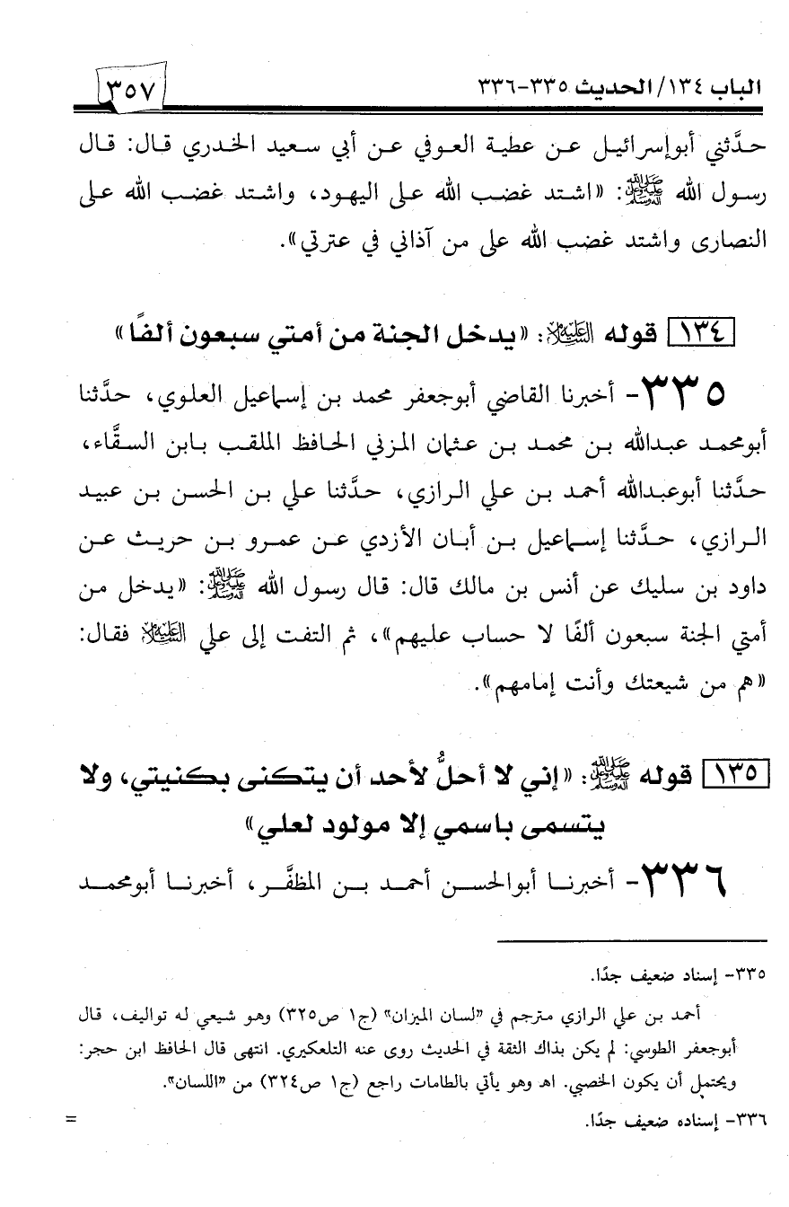 335 - أخبرنا القاضي أبو جعفر محمد بن إسماعيل العلوي، حدثنا أبو محمد عبد الله بن محمد بن عثمان المزني الحافظ الملقب بابن السقاء، حدثنا أبو عبد الله أحمد بن علي الرازي، حدثنا علي بن الحسن بن عبيد الرازي، حدثنا إسماعيل بن أبان الأزدي عن عمرو بن حريث عن داود بن سليك عن أنس بن مالك قال: قال رسول الله صلى الله عليه وسلم: ((يدخل من أمتي الجنة سبعون ألفاً لا حساب عليهم))، ثم التفت إلي علي عليه السلام فقال: ((هم من شيعتك وأنت إمامهم)).