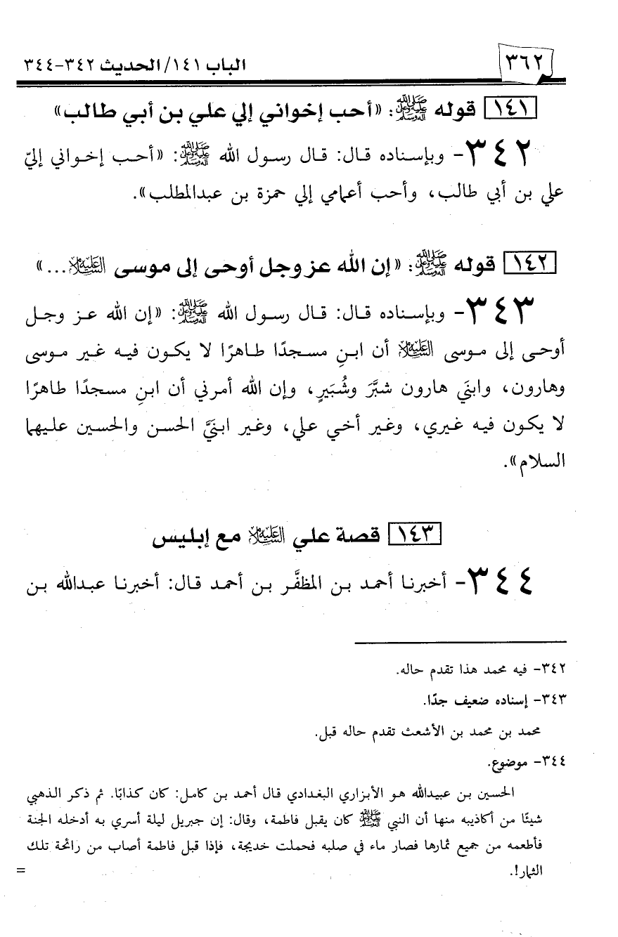 343 - وبإسناده قال: قال رسول الله صلى الله عليه وسلم: ((إن الله عز وجل أوحى إلى موسى عليه السلام أن ابن مسجداً طاهراً لا يكون فيه غير موسى وهارون، وابني هارون شبر وشبير، وإن الله أمرني أن ابن مسجداً طاهراً لا يكون فيه غيري، وغير أخي علي، وغير ابني الحسن والحسين عليهما السلام)).