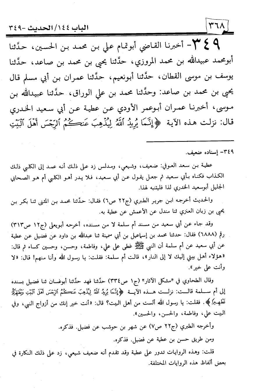 349 - أخبرنا القاضي أبو تمام علي بن محمد بن الحسين، حدثنا أبو محمد عبيد الله بن محمد المروزي، حدثنا يحيى بن محمد بن صاعد، حدثنا يوسف بن موسى القطان، حدثنا أبو نعيم، حدثنا أبو عمران بن أبي مسلم قال يحيى بن محمد بن صاعد: وحدثنا محمد بن علي الوراق، حدثنا عبيد الله بن موسى، أخبرنا عمران أبو عمر الأودي عن عطية عن أبي سعيد الخدري قال: نزلت هذه الآية: {إنما يريد الله ليذهب عنكم الرجس أهل البيت -[369]- ويطهركم تطهيرا}، في نبي الله وعلي وفاطمة وحسن وحسين، قال فجللهم رسول الله صلى الله عليه وسلم بكساء وقال: ((اللهم هؤلاء أهل بيتي فأذهب عنهم الرجس وطهرهم تطهيرا))، قال: وأم سلمة على باب البيت فقالت: يا رسول الله وأنا! قال: ((إنك لبخير أو على خير)).