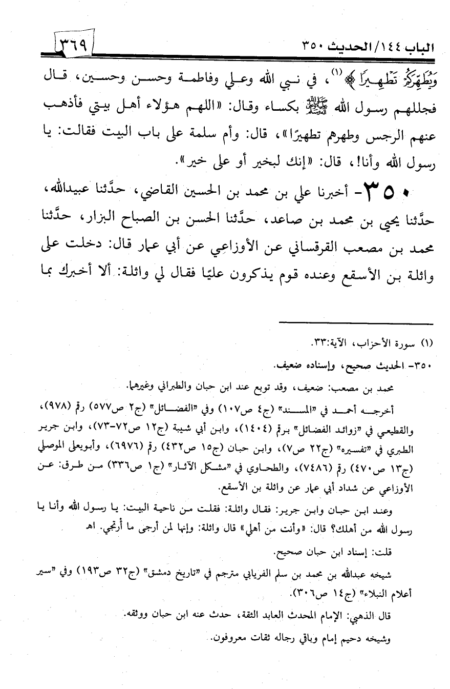 350 - أخبرنا علي بن محمد بن الحسين القاضي، حدثنا عبيد الله، حدثنا يحيى بن محمد بن صاعد، حدثنا الحسن بن الصباح البزار، حدثنا محمد بن مصعب القرقساني عن الأوزاعي عن أبي عمار قال: دخلت على واثلة بن الأسقع وعنده قوم يذكرون علياً فقال لي واثلة: ألا أخبرك بما -[370]- رأيت من رسول الله صلى الله عليه وسلم! قلت: بلى، قال: أتيت فاطمة عليها السلام فسألتها عن علي فقال: توجه إلى رسول الله صلى الله عليه وسلم، فجلست أنتظره فجاء رسول الله صلى الله عليه وسلم وعلي معه فدخل معهم البيت، فأدنى علياً وفاطمة فأجلس واحداً عن يمينه والآخر عن يساره، ودعا بالحسن والحسين فأجلس كل واحد منهما على فخذه، ثم قال: {إنما يريد الله ليذهب عنكم الرجس أهل البيت ويطهركم تطهيرا}، اللهم هؤلاء أهل بيتي وأهل بيتي أحق)).