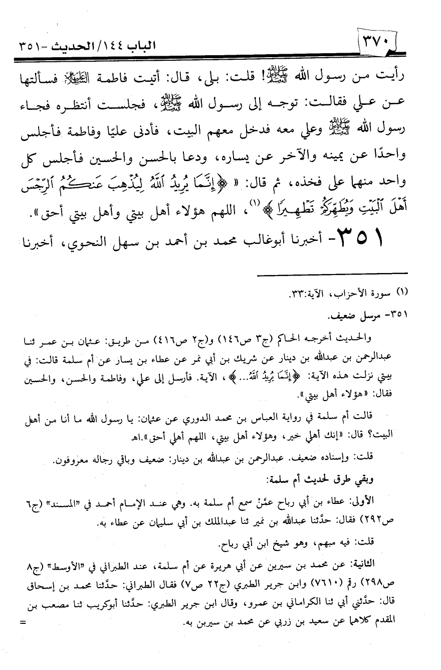 351 - أخبرنا أبو غالب محمد بن أحمد بن سهل النحوي، أخبرنا -[373]- أبو الحسن علي بن منصور الأخباري الحلبي، حدثنا علي بن محمد الشمشاطي، حدثنا محمد بن يحيى، حدثنا العباس بن الفضل، حدثنا -[374]- يعقوب بن حميد، حدثنا أنس بن غياض الليثي عن شريك بن عبد الله بن أبي نمر عن عطاء بن يسار قال: نزلت في بيت أم سلمة {إنما يريد الله ليذهب عنكم الرجس أهل البيت ويطهركم تطهيرا}، فأخذ النبي صلى الله عليه وسلم ثوباً ودعا فاطمة، وعلياً والحسن، والحسين عليهم السلام فجعله عليهم وقال: {إنما يريد الله ليذهب عنكم الرجس}، الآية. فقالت أم سلمة من جانب البيت: ألست من أهل البيت يا رسول الله؟ قال: ((بلى إن شاء الله)). قال يعقوب بن حميد: وفي ذلك يقول الشاعر: