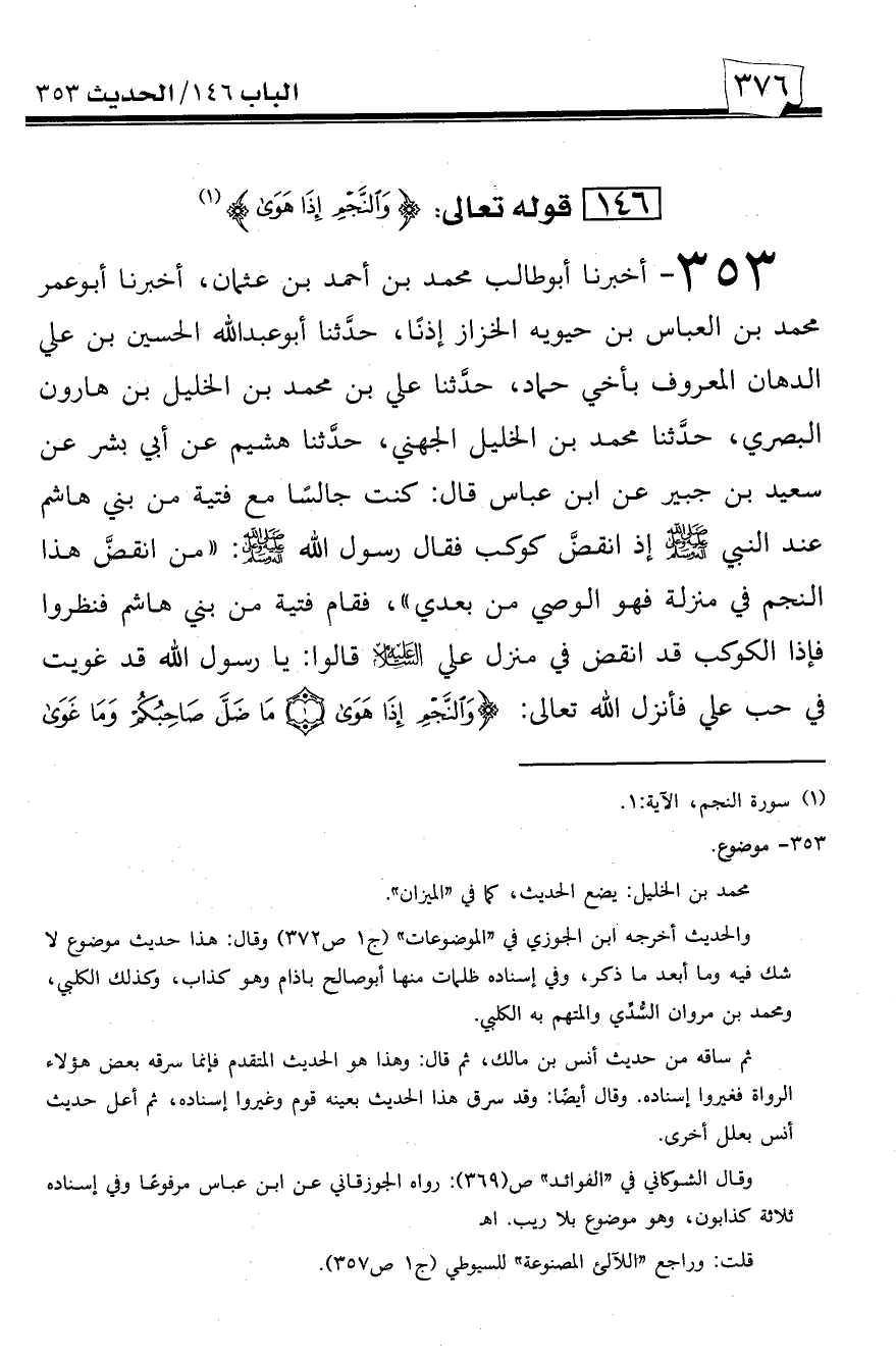 353 - أخبرنا أبو طالب محمد بن أحمد بن عثمان، أخبرنا أبو عمر محمد بن العباس بن حيويه الخزاز إذناً، حدثنا أبو عبد الله الحسين بن علي الدهان المعروف بأخي حماد، حدثنا علي بن محمد بن الخليل بن هارون البصري، حدثنا محمد بن الخليل الجهني، حدثنا هشيم عن أبي بشر عن سعيد بن جبير عن ابن عباس قال: كنت جالساً مع فتية من بني هاشم عند النبي صلى الله عليه وسلم إذ انقض كوكب فقال رسول الله صلى الله عليه وسلم: ((من انقض هذا النجم في منزله فهو الوصي من بعدي))، فقام فتية من بني هاشم فنظروا فإذا الكوكب قد انقض في منزل علي عليه السلام قالوا: يا رسول الله قد غويت في حب علي فأنزل الله تعالى: {والنجم إذا هوى. ما ضل صاحبكم وما غوى. -[377]- وما ينطق عن الهوى. إن هو إلا وحيٌ يوحى. علمه شديد القوى. ذو مرةٍ فاستوى. وهو بالأفق الأعلى}.