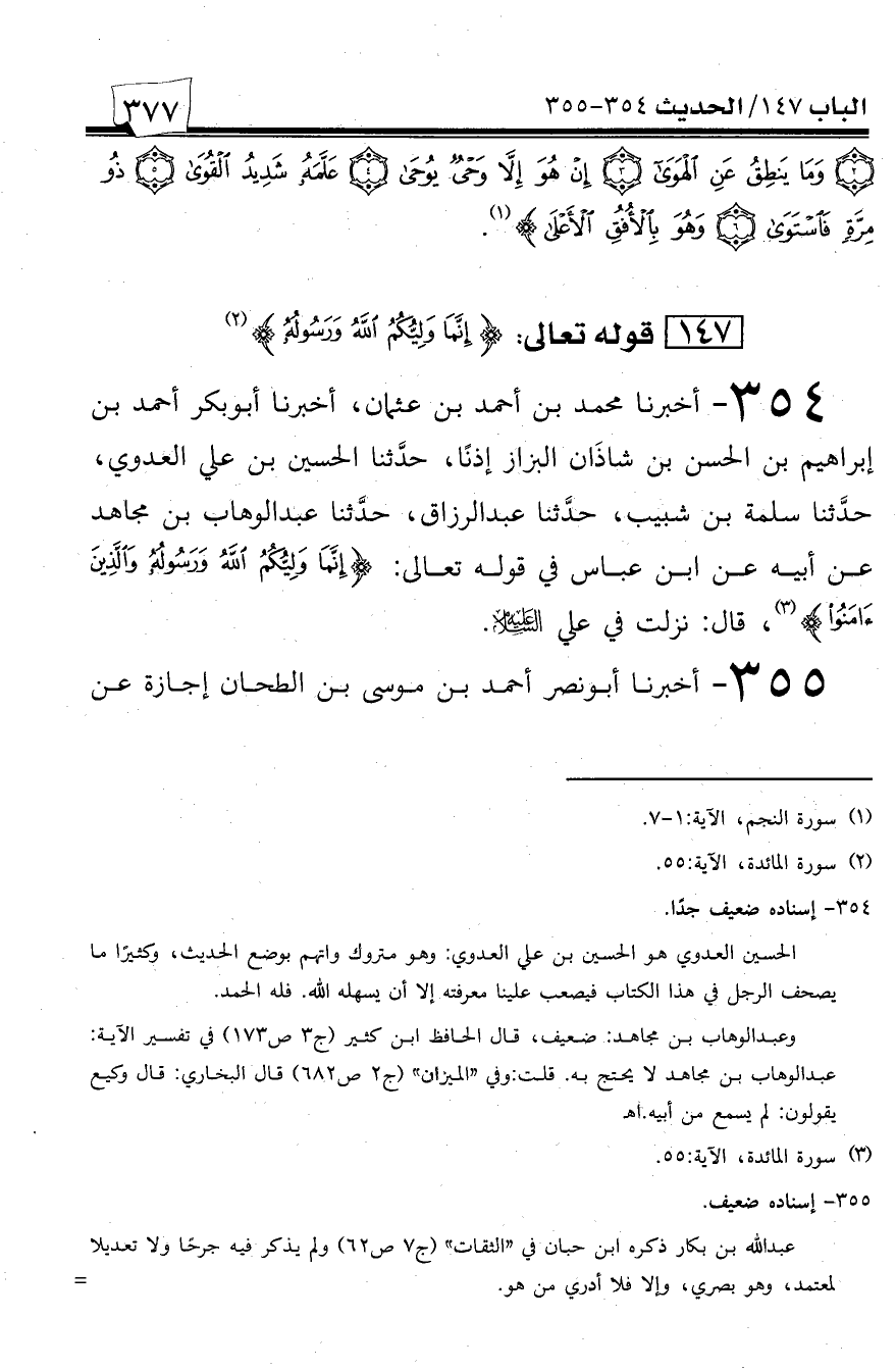 354 - أخبرنا محمد بن أحمد بن عثمان، أخبرنا أبو بكر أحمد بن إبراهيم بن الحسن بن شاذان البزاز إذناً، حدثنا الحسين بن علي العدوي، حدثنا سلمة بن شبيب، حدثنا عبد الرزاق، حدثنا عبد الوهاب بن مجاهد عن أبيه عن ابن عباس في قوله تعالى: {إنما وليكم الله ورسوله والذين آمنوا}، قال: نزلت في علي عليه السلام.