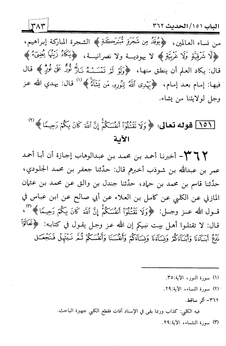 362 - أخبرنا أحمد بن محمد بن عبد الوهاب إجازة أن أبا أحمد عمر بن عبد الله بن شوذب أخبرهم قال: حدثنا جعفر بن محمد الجلودي، حدثنا قاسم بن محمد بن حماد، حدثنا جندل بن والق عن محمد بن عثمان المازني عن الكلبي عن كامل بن العلاء عن أبي صالح عن ابن عباس في قول الله عز وجل: {ولا تقتلوا أنفسكم إن الله كان بكم رحيماً}، قال: لا تقتلوا أهل بيت نبيكم إن الله عز وجل يقول في كتابه: {تعالوا ندع أبناءنا وأبناءكم ونساءنا ونساءكم وأنفسنا وأنفسكم ثم نبتهل فنجعل -[384]- لعنت الله على الكاذبين}، قال: كان أبناء هذه الأمة: الحسن، والحسين، وكان نساؤها فاطمة، وأنفسهم النبي وعلي.