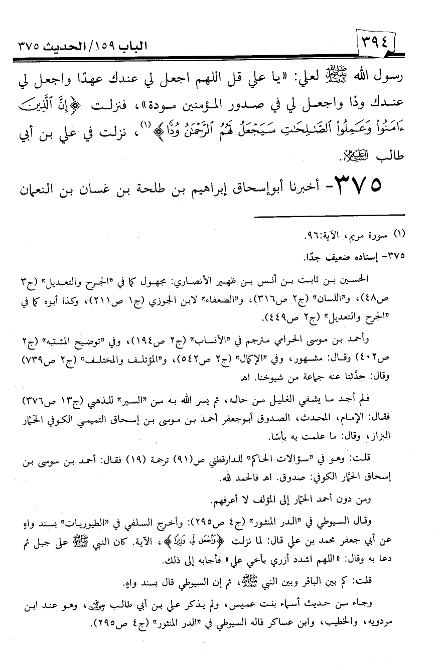 375 - أخبرنا أبو إسحاق إبراهيم بن طلحة بن غسان بن النعمان -[395]- الكازروني -إجازة- أن عمر بن محمد بن يوسف حدثهم قال: حدثنا أبو إسحاق المديني، حدثنا أحمد بن موسى الحرامي، حدثنا الحسين بن ثابت المدني خادم موسى بن جعفر حدثني أبي عن شعبة عن الحكم عن عكرمة عن ابن عباس قال: أخذ رسول الله صلى الله عليه وسلم بيدي وأخذ بيد علي فصلى أربع ركعات، ثم رفع يده إلى السماء فقال: ((اللهم سألك موسى بن عمران، وإن محمداً سألك أن تشرح لي صدري، وتيسر لي أمري، وتحل عقدة من لساني يفقهوا قولي، واجعل لي وزيراً من أهلي! علياً اشدد به أزري، وأشركه في أمري!)). قال ابن عباس: فسمعت منادياً ينادي: يا أحمد! قد أوتيت ما سألت. فقال النبي: ((يا أبا الحسن ارفع يدك إلى السماء، وادع ربك وسله يعطك))، فرفع علي يده إلى السماء وهو يقول: اللهم اجعل لي عندك عهداً واجعل لي عندك وداً. فأنزل الله على نبيه {إن الذين آمنوا وعملوا الصالحات سيجعل لهم الرحمن ودا}، فتلاها النبي صلى الله عليه وسلم على أصحابه فعجبوا من ذلك عجباً شديداً، فقال النبي صلى الله عليه وسلم: ((مم تعجبون؟ إن القرآن أربعة أرباع: فربع فينا أهل البيت خاصة، وربع في أعدائنا، وربع حلال وحرام، وربع فرائض وأحكام، والله أنزل في علي كرائم القرآن)).