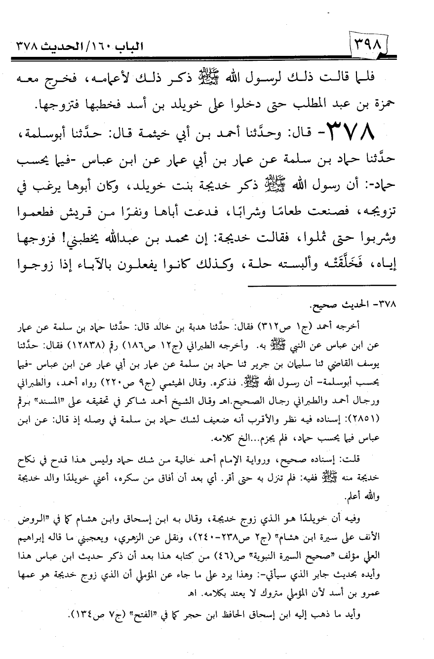 378 - قال: وحدثنا أحمد بن أبي خيثمة قال: حدثنا أبو سلمة، حدثنا حماد بن سلمة عن عمار بن أبي عمار عن ابن عباس -فيما يحسب حماد-: أن رسول الله صلى الله عليه وسلم ذكر خديجة بنت خويلد، وكان أبوها يغرب في تزويجه، فصنعت طعاماً وشراباً، فدعت أباها ونفراً من قريش فطعموا وشربوا حتى ثملوا، فقالت خديجة: إن محمد بن عبد الله يخطبني! فزوجها إياه، فخلقته وألبسته حلة، وكذلك كانوا يفعلون بالآباء إذا زوجوا -[399]- بناتهم، فلما سري عنه السكر، فإذا هو مخلق وعليه حلة! فقال: ما شأني؟ قالت خديجة: زوجتني من محمد بن عبد الله، قال: أنا أزوج يتيم أبي طالب؟ لا لعمرو الله!، فقالت خديجة: ألا تستحي تريد أن تسفه نفسك عند قريش تخبر الناس أنك كنت سكران؟ فلم تزل به حتى أقر. وقال أبو عبيدة: تزوج خديجة وهو ابن خمس وعشرين.