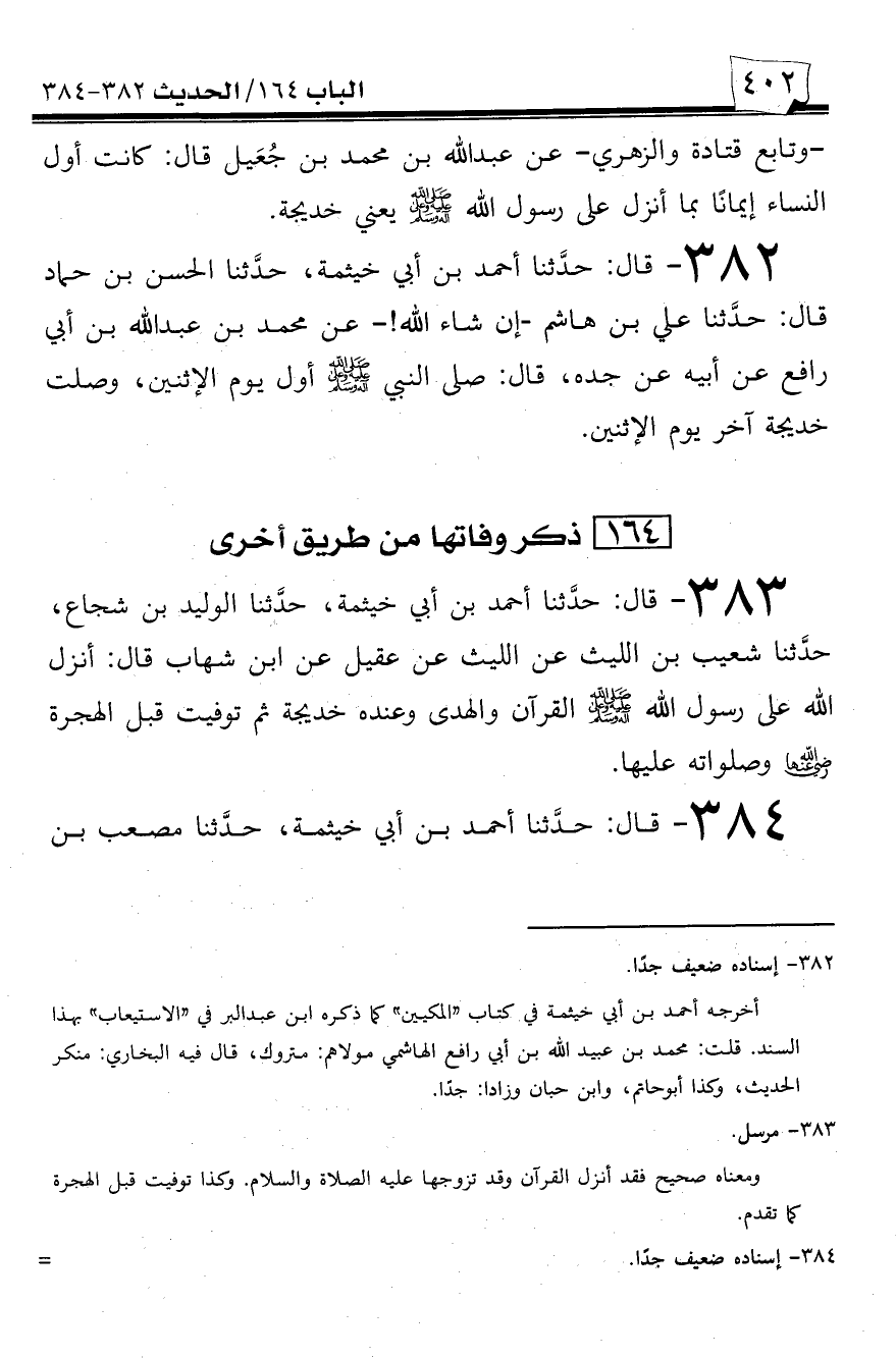 383 - قال: حدثنا أحمد بن أبي خيثمة، حدثنا الوليد بن شجاع، حدثنا شعيب بن الليث عن الليث عن عقيل عن ابن شهاب قال: أنزل الله على رسول الله صلى الله عليه وسلم القرآن والهدى وعنده خديجة ثم توفيت قبل الهجرة رضي الله عنها وصولاته عليها.