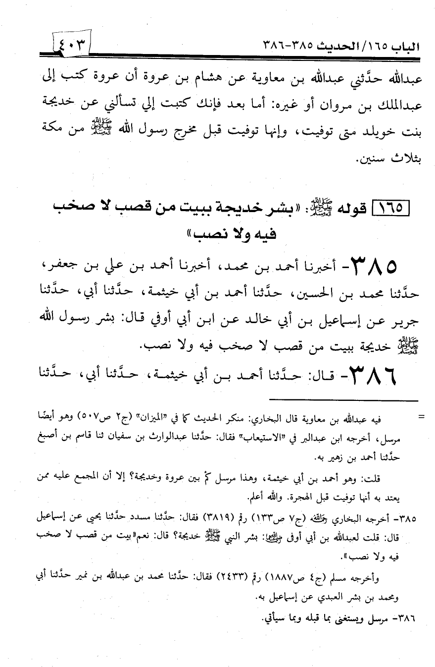 385 - أخبرنا أحمد بن محمد، أخبرنا أحمد بن علي بن جعفر، حدثنا محمد بن الحسين، حدثنا أحمد بن أبي خيثمة، حدثنا أبي، حدثنا جرير عن إسماعيل بن أبي خالد عن ابن أبي أوفي قال: بشر رسول الله صلى الله عليه وسلم خديجة ببيت من قصب لا صخب فيه ولا نصب.