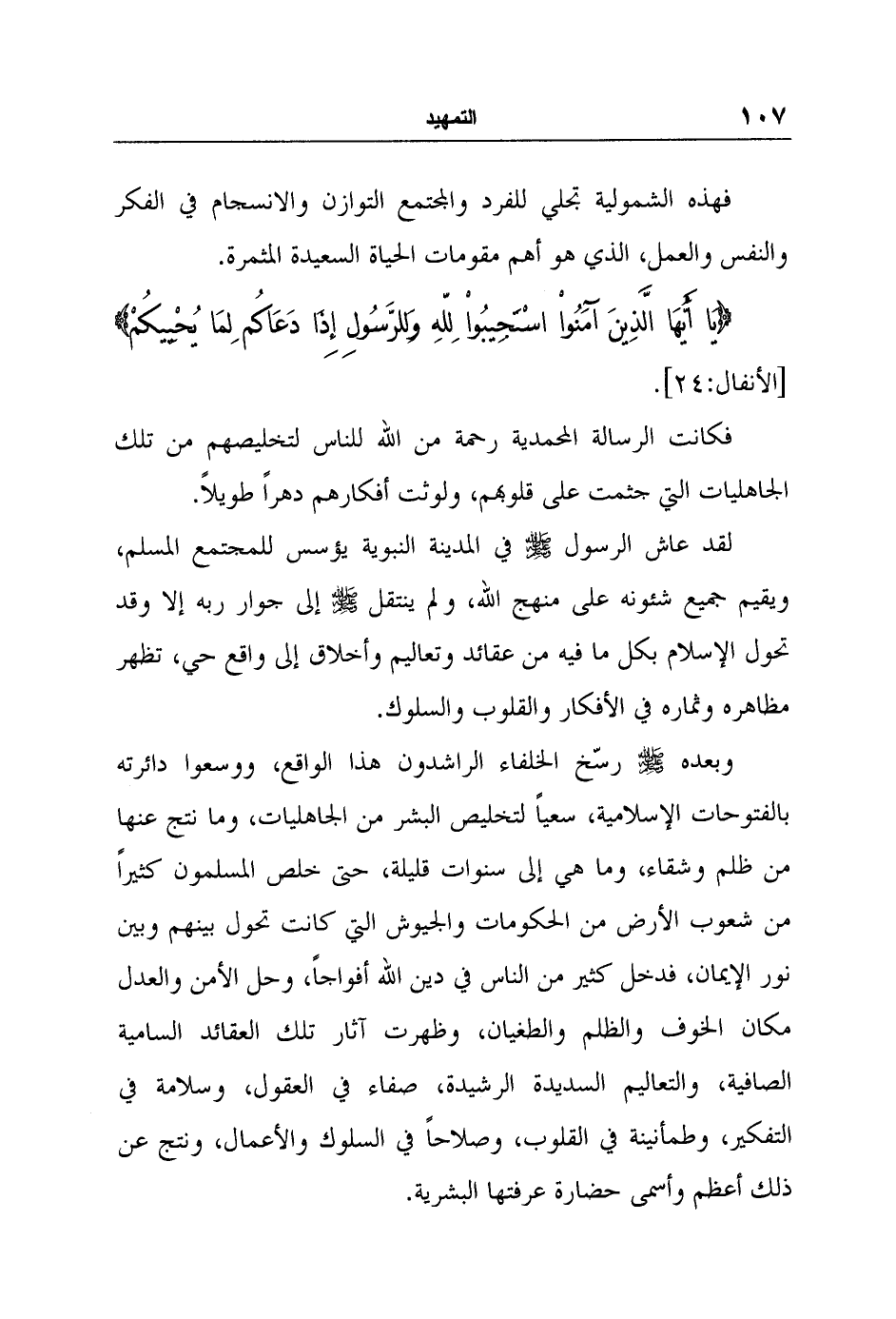 فهذه الشمولية تجلي للفرد والمجتمع التوازن والانسجام في الفكر والنفس والعمل، الذي هو أهم مقومات الحياة السعيدة المثمرة. {يَا أَيُّهَا الَّذِينَ آمَنُوا اسْتَجِيبُوا لِلَّهِ وَلِلرَّسُولِ إِذَا دَعَاكُمْ لِمَا يُحْيِيكُمْ} [الأنفال:24] .