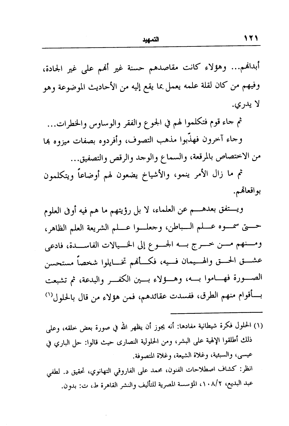 ويتفق بعدهم عن العلماء، لا بل رؤيتهم ما هم فيه أوفى العلوم حتى سموه علم الباطن، وجعلوا علم الشريعة العلم الظاهر، ومنهم من خرج به الجوع إلى الخيالات الفاسدة، فادعى عشق الحق والهيمان فيه، فكأنهم تخايلوا شخصاً مستحسن الصورة فهاموا به، وهؤلاء بين الكفر والبدعة، ثم تشبعت بأقوام منهم الطرق، ففسدت عقائدهم، فمن هؤلاء منقالبا بالحلول1