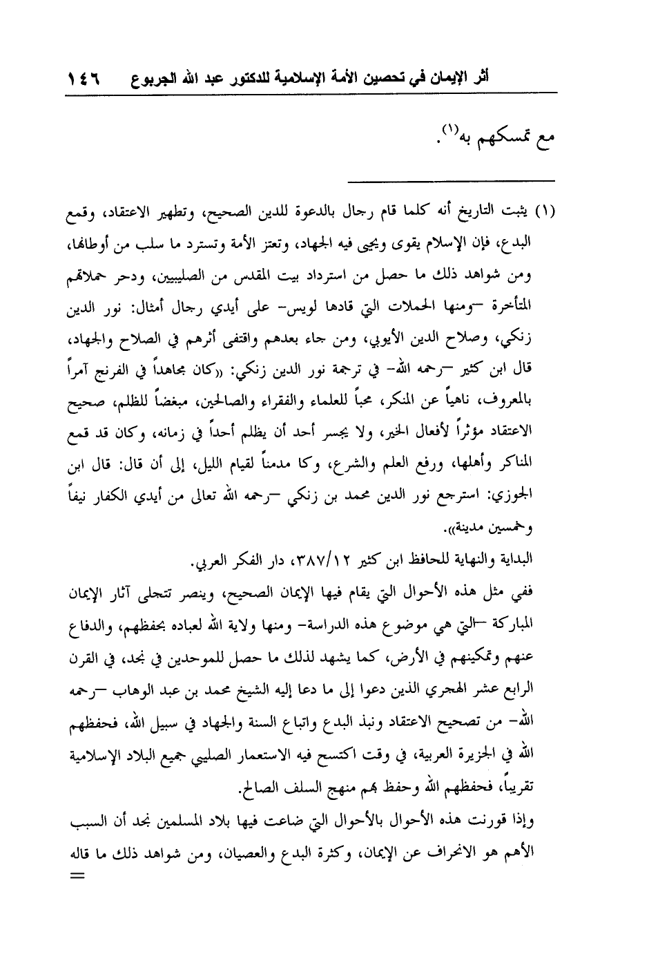 1 يثبت التاريخ أنه كلما قام رجال بالدعوة للدين الصحيح، وتطهير الاعتقاد، وقمع البدع، فإن الإسلام يقوى ويحيى فيه الجهاد، وتعتز الأمة وتسترد ما سلب من أوطانها، ومن شواهد ذلك ما حصل من استرداد بيت المقدس من الصليبيين، ودحر حملاتهم المتأخرة –ومنها الحملات التي قادها لويس- على أيدي رجال أمثال: نور الدين زنكي، وصلاح الدين الأيوبي، ومن جاء بعدهم واقتفى أثرهم في الصلاح والجهاد، قال ابن كثير –رحمه الله- في ترجمة نور الدين زنكي:"كان مجاهداً في الفرنج آمراً بالمعروف، ناهياً عن المنكر، محباً للعلماء والفقراء والصالحين، مبغضاً للظلم، صحيح الاعتقاد مؤثراً لأفعال الخير، ولا يجسر أحد أن يظلم أحداً في زمانه، وكان قد قمع المناكر وأهلها، ورفع العلم والشرع، وكان مدمناً لقيام الليل، إلى أن قال: قال ابن الجوزي: استرجع نور الدين محمد بن زنكي –رحمه الله تعالى- من أيدي الكفار نيفاً وخمسين مدينة".