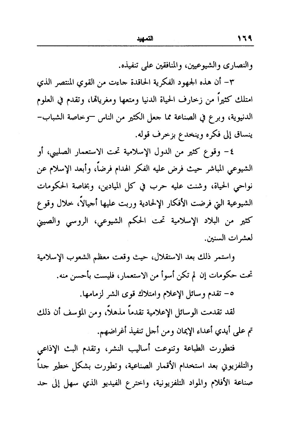 4- وقوع كثير من الدول الإسلامية تحت الاستعمار الصليبي، أو الشيوعي المباشر حيث فرض عليه الفكر الهدام فرضاً، وأبعد الإسلام عن نواحي الحياة، وشنت عليه حرب في كل الميادين، وبخاصة الحكومات الشيوعية التي فرضت الأفكار الإلحادية وربت عليها أجيالاً، خلال وقوع كثير من البلاد الإسلامية تحت الحكم الشيوعي، الروسي والصيني لعشرات السنين.