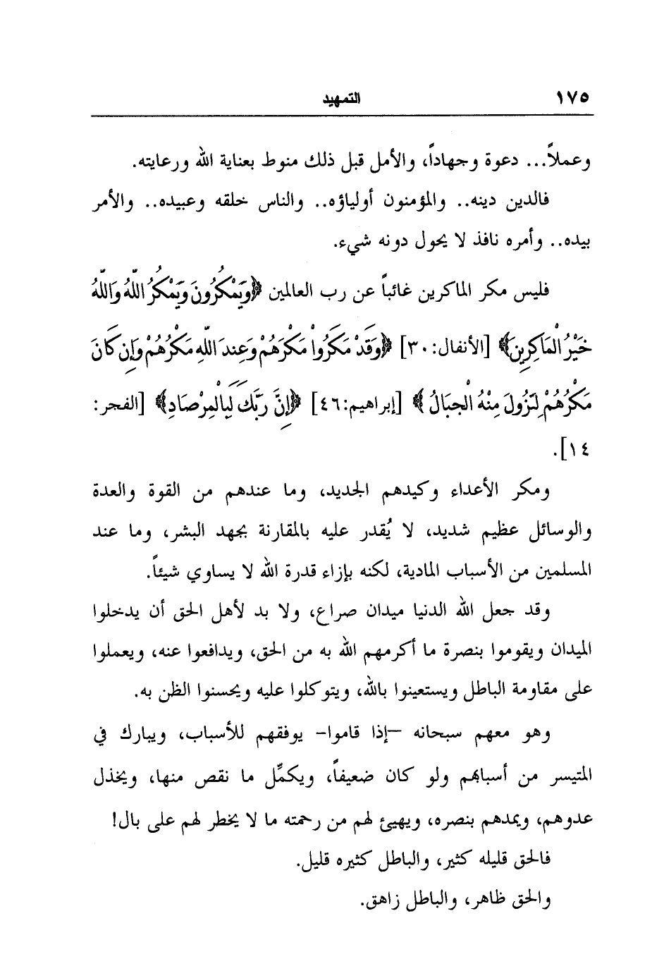وقد جعل الله الدنيا ميدان صراع، ولا بد لأهل الحق أن يدخلوا الميدان ويقوموا بنصرة ما أكرمهم الله به من الحق، ويدافعوا عنه، ويعملوا على مقاومة الباطل ويستعينوا بالله، ويتوكلوا عليه ويحسنوا الظن به. وهو معهم سبحانه –إذا قاموا- يوفقهم للأسباب، ويبارك في المتيسر من أسبابهم ولو كان ضعيفاً، ويكمِّل ما نقص منها، ويخذل عدوهم، ويمدهم بنصره، ويهيئ لهم من رحمته ما لا يخطر لهم على بال! فالحق قليله كثير، والباطل كثيره قليل. والحق ظاهر، والباطل زاهق.