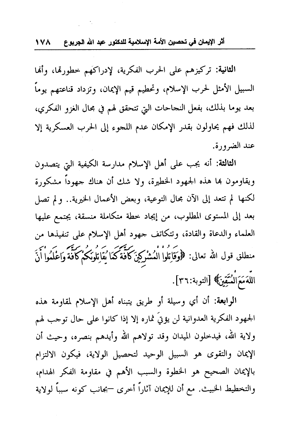 الرابعة: أن أي وسيلة أو طريق يتبناه أهل الإسلام لمقاومة هذه الجهود الفكرية العدوانية لن يؤتيَ ثماره إلا إذا كانوا على حال توجب لهم ولاية الله، فيدخلون الميدان وقد تولاهم الله وأيدهم بنصره، وحيث أن الإيمان والتقوى هو السبيل الوحيد لتحصيل الولاية، فيكون الالتزام بالإيمان الصحيح هو الخطوة والسبب الأهم في مقاومة الفكر الهدام، والتخطيط الخبيث. مع أن للإيمان آثاراً أخرى –بجانب كونه سبباً لولاية