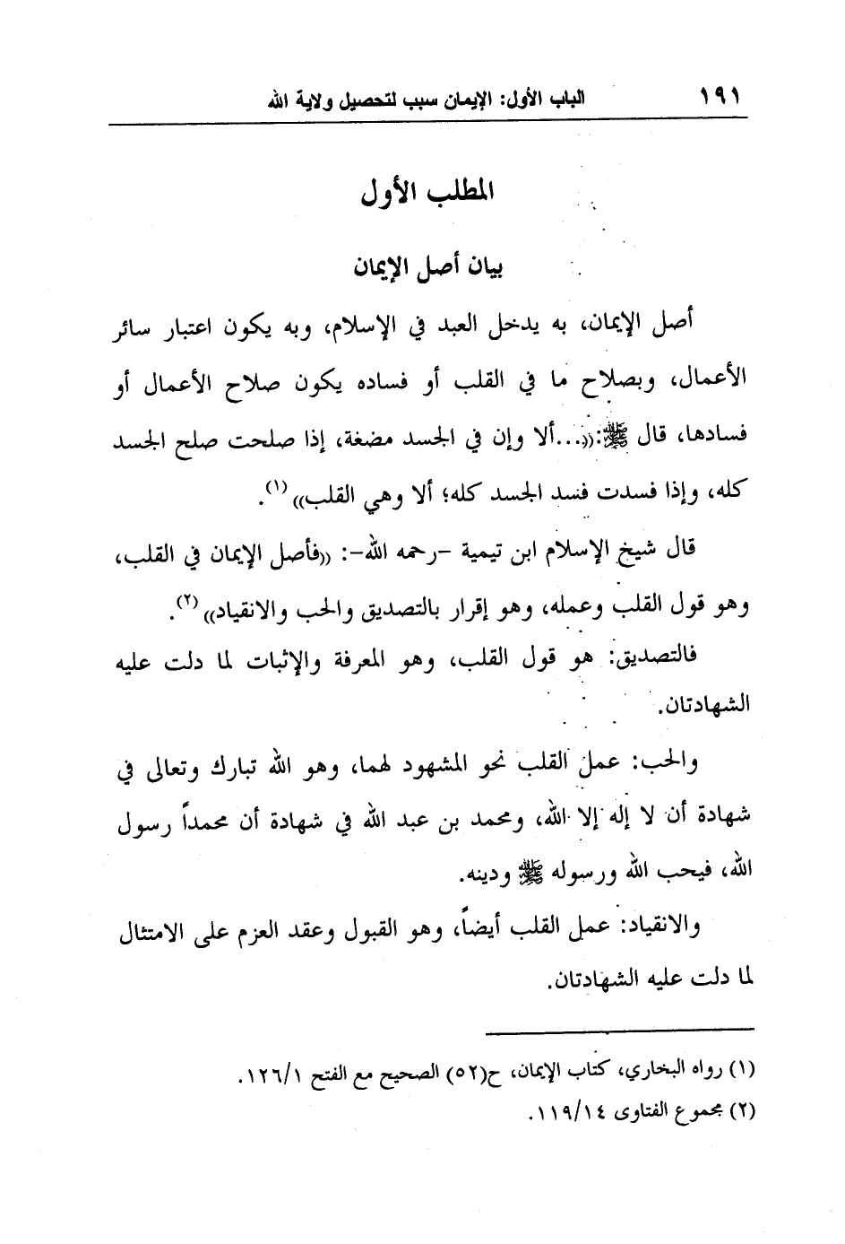 أصل الإيمان، به يدخل العبد في الإسلام، وبه يكون اعتبار سائر الأعمال، وبصلاح ما في القلب أو فساده يكون صلاح الأعمال أو فسادها، قال صلى الله عليه وسلم:" ... ألا وإن في الجسد مضغة، إذا صلحت صلح الجسد كله، وإذا فسدت فسد الجسد كله؛ ألا وهي القلب " 1.