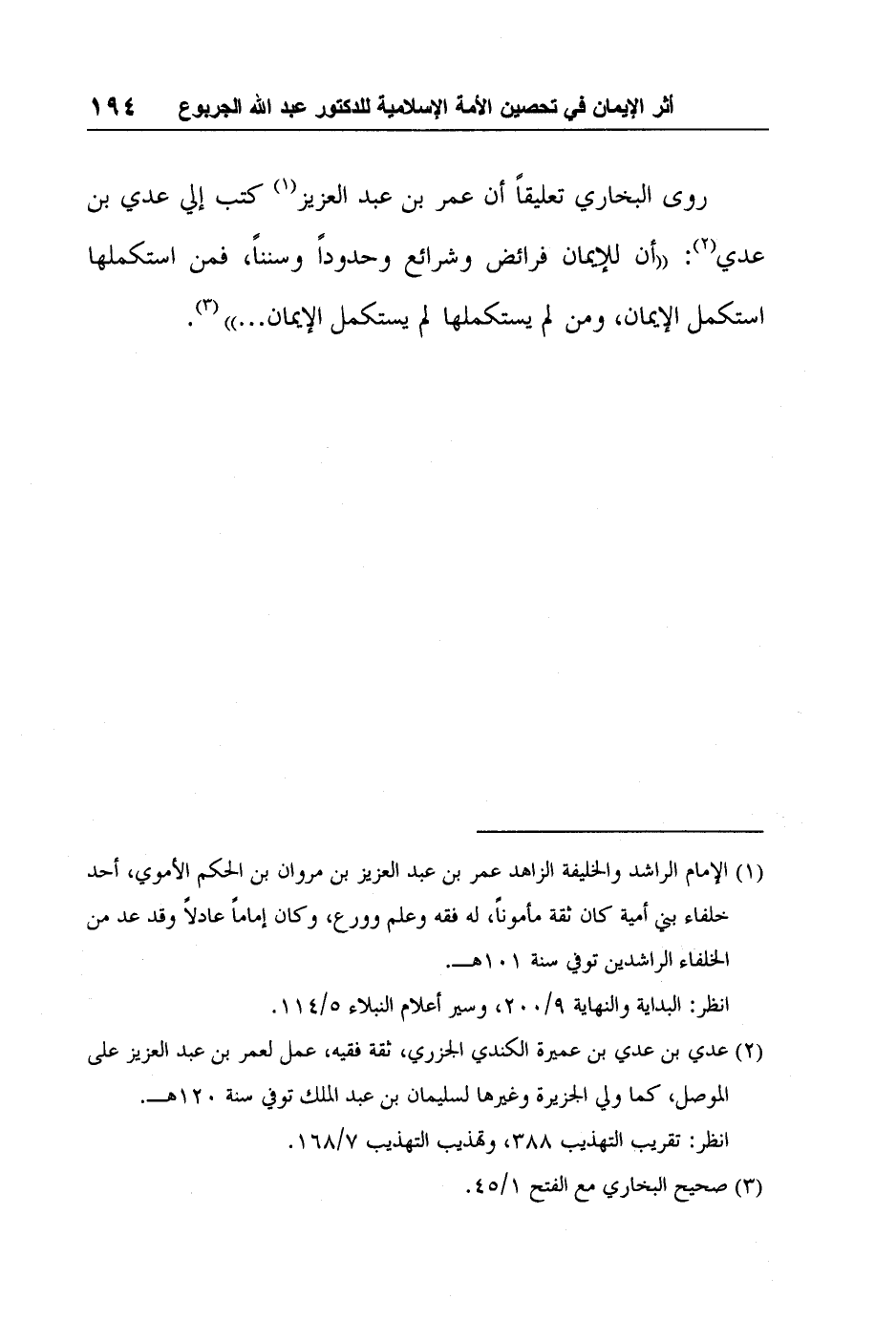 روى البخاري تعليقاً أن عمر بن عبد العزيز1 كتب إلي عدي بن عدي2: "أن للإيمان فرائض وشرائع وحدوداً وسنناً، فمن استكملها استكمل الإيمان، ومن لم يستكملها لم يستكمل الإيمان ... " 3.