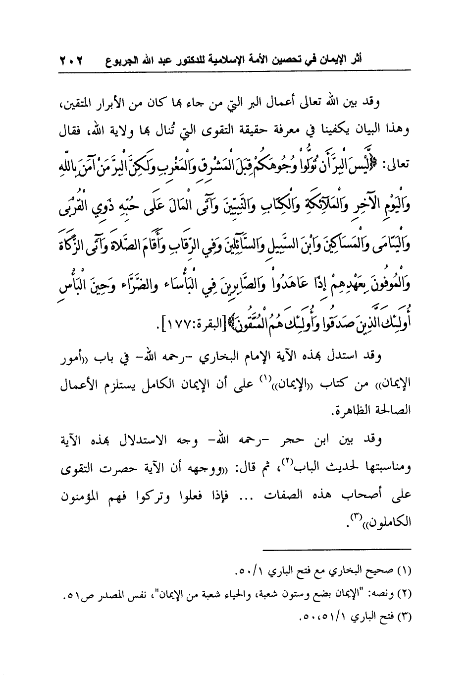 وقد بين ابن حجر -رحمه الله- وجه الاستدلال بهذه الآية ومناسبتها لحديث الباب2، ثم قال: "ووجهه أن الآية حصرت التقوى على أصحاب هذه الصفات ... فإذا فعلوا وتركوا فهم المؤمنون الكاملون"3.