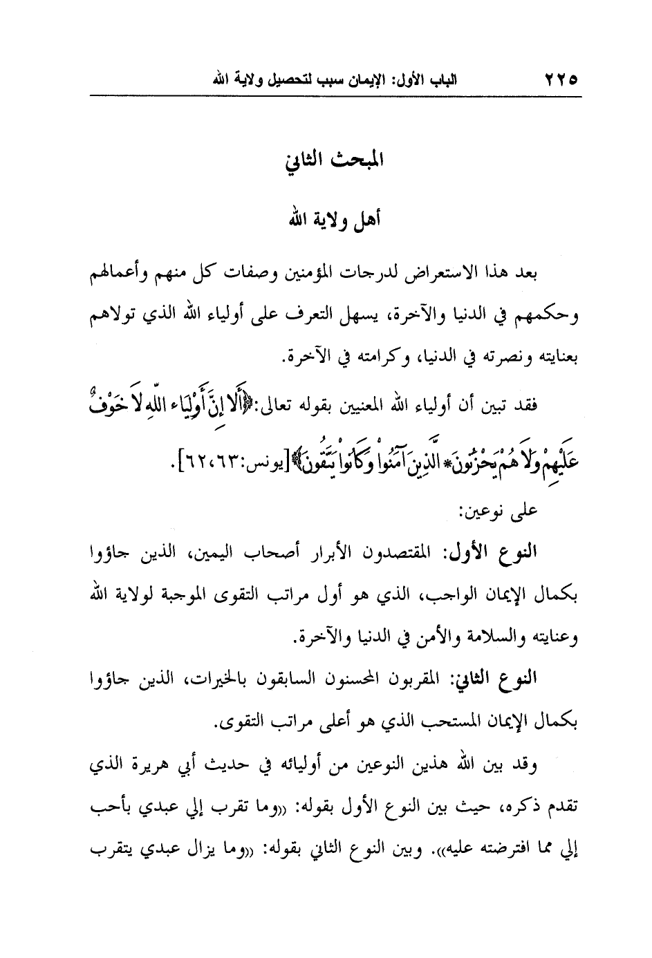 وقد بين الله هذين النوعين من أوليائه في حديث أبي هريرة الذي تقدم ذكره، حيث بين النوع الأول بقوله: " وما تقرب إلي عبدي بأحب إلي مما افترضته عليه ". وبين النوع الثاني بقوله: " وما يزال عبدي يتقرب