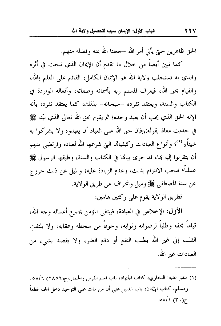 كما تبين أيضاً من خلال ما تقدم أن الإيمان الذي نبحث في أثره والذي به تستجلب ولاية الله هو الإيمان الكامل، القائم على العلم بالله، والقيام بحق الله، فيعرف المسلم ربه بأسمائه وصفاته، وأفعاله الواردة في الكتاب والسنة، ويعتقد تفرده -سبحانه- بذلك، كما يعتقد تفرده بأنه الإله الحق الذي يجب أن يعبد وحده؛ ثم يقوم بحق الله تعالى الذي بيّنه صلى الله عليه وسلم في حديث معاذ بقوله: " فإن حق الله على العباد أن يعبدوه ولا يشركوا به شيئاً " 1؛ وأنواع العبادات وكيفياتها التي شرعها الله لعباده وارتضى منهم أن يتقربوا إليه بها، قد جرى بيانها في الكتاب والسنة، وطبقها الرسول صلى الله عليه وسلم عملياً؛ فيجب الالتزام بذلك، وعدم الزيادة عليه؛ والميل عن ذلك خروج عن سنة المصطفى صلى الله عليه وسلم وميل وانحراف عن طريق الولاية.
