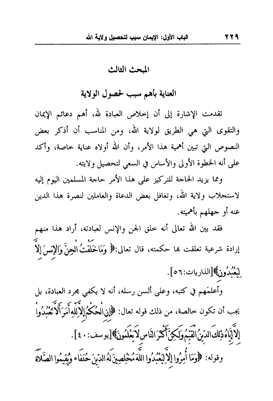 تقدمت الإشارة إلى أن إخلاص العبادة لله، أهم دعائم الإيمان والتقوى التي هي الطريق لولاية الله، ومن المناسب أن أذكر بعض النصوص التي تبين أهمية هذا الأمر، وأن الله أولاه عناية خاصة، وأكد على أنه الخطوة الأولى والأساس في السعي لتحصيل ولايته.