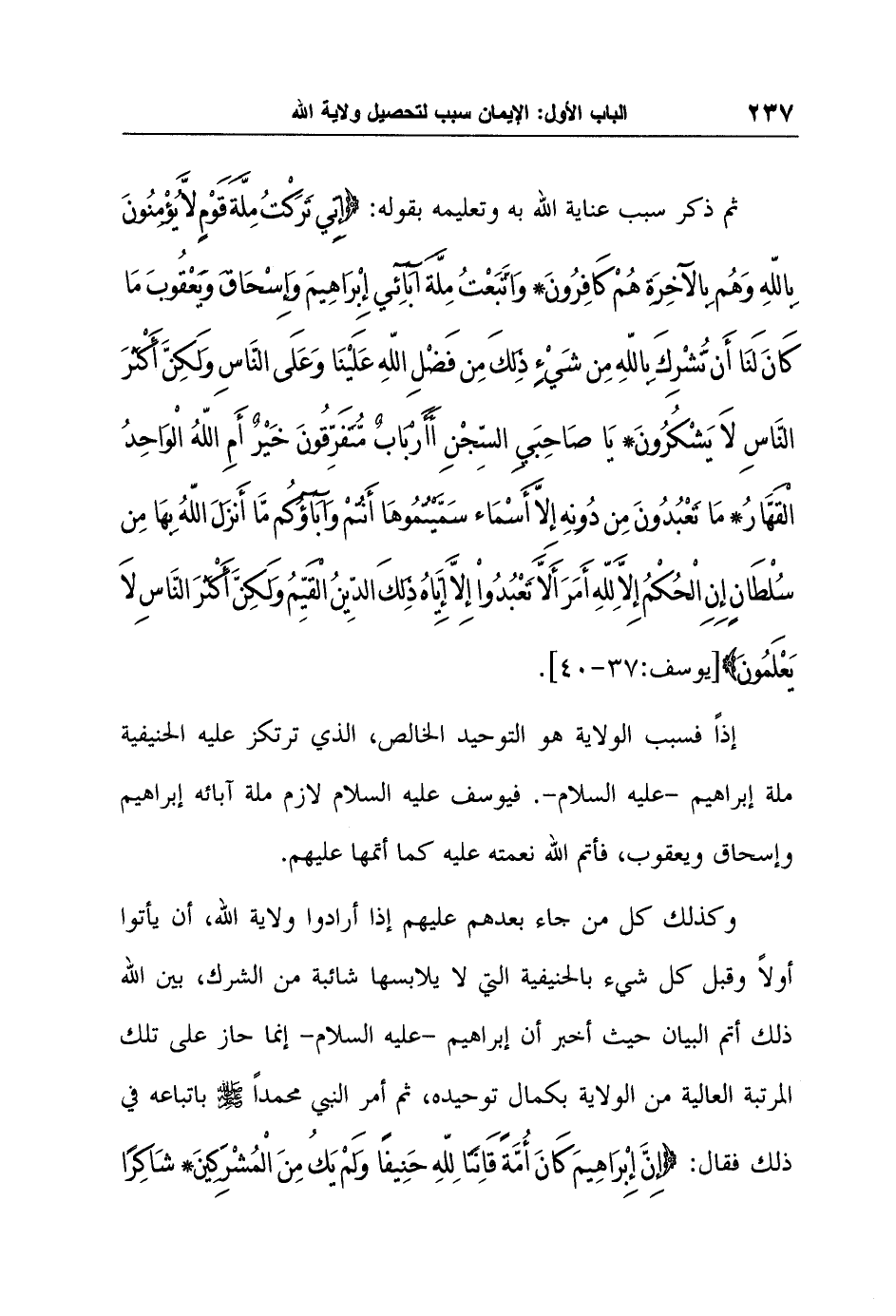 وكذلك كل من جاء بعدهم عليهم إذا أرادوا ولاية الله، أن يأتوا أولاً وقبل كل شيء بالحنيفية التي لا يلابسها شائبة من الشرك، بين الله ذلك أتم البيان حيث أخبر أن إبراهيم -عليه السلام- إنما حاز على تلك المرتبة العالية من الولاية بكمال توحيده، ثم أمر النبي محمداً صلى الله عليه وسلم باتباعه في ذلك فقال: {إِنَّ إِبْرَاهِيمَ كَانَ أُمَّةً قَانِتاً لِلَّهِ حَنِيفاً وَلَمْ يَكُ مِنَ الْمُشْرِكِينَ شَاكِراً