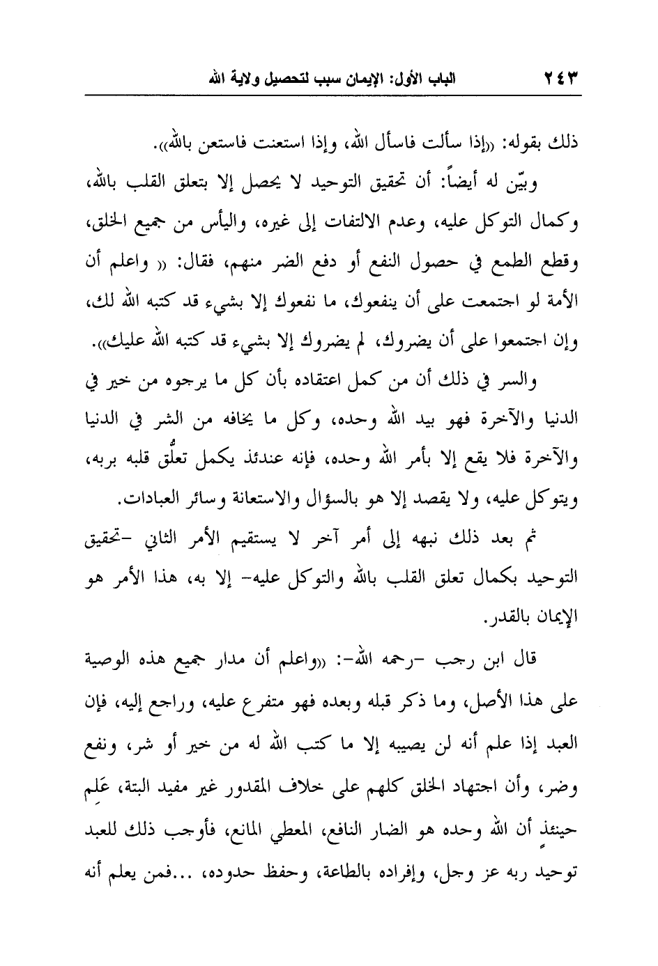 وبيّن له أيضاً: أن تحقيق التوحيد لا يحصل إلا بتعلق القلب بالله، وكمال التوكل عليه، وعدم الالتفات إلى غيره، واليأس من جميع الخلق، وقطع الطمع في حصول النفع أو دفع الضر منهم، فقال: " واعلم أن الأمة لو اجتمعت على أن ينفعوك، ما نفعوك إلا بشيء قد كتبه الله لك، وإن اجتمعوا على أن يضروك، لم يضروك إلا بشيء قد كتبه الله عليك ".