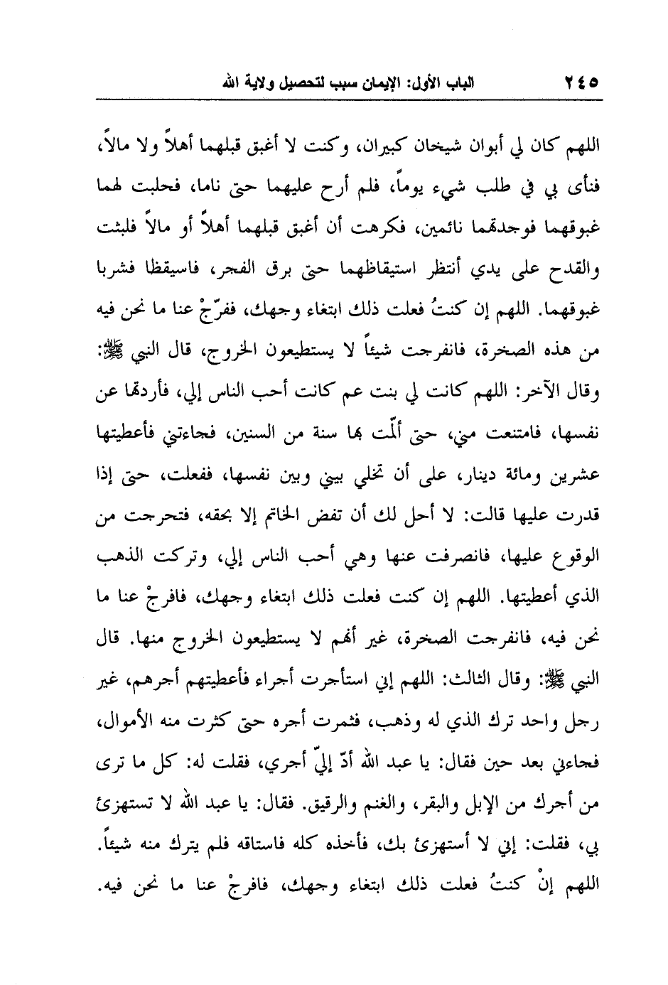 اللهم كان لي أبوان شيخان كبيران، وكنت لا أغبق قبلهما أهلاً ولا مالاً، فنأى بي في طلب شيء يوماً، فلم أرح عليهما حتى ناما، فحلبت لهما غبوقهما فوجدتهما نائمين، فكرهت أن أغبق قبلهما أهلاً أو مالاً فلبثت والقدح على يدي أنتظر استيقاظهما حتى برق الفجر، فاسيقظا فشربا غبوقهما. اللهم إن كنتُ فعلت ذلك ابتغاء وجهك، ففرّجْ عنا ما نحن فيه من هذه الصخرة، فانفرجت شيئاً لا يستطيعون الخروج، قال النبي صلى الله عليه وسلم: وقال الآخر: اللهم كانت لي بنت عم كانت أحب الناس إلي، فأردتها عن نفسها، فامتنعت مني، حتى ألمّت بها سنة من السنين، فجاءتني فأعطيتها عشرين ومائة دينار، على أن تخلي بيني وبين نفسها، ففعلت، حتى إذا قدرت عليها قالت: لا أحل لك أن تفض الخاتم إلا بحقه، فتحرجت من الوقوع عليها، فانصرفت عنها وهي أحب الناس إلي، وتركت الذهب الذي أعطيتها. اللهم إن كنت فعلت ذلك ابتغاء وجهك، فافرجْ عنا ما نحن فيه، فانفرجت الصخرة، غير أنهم لا يستطيعون الخروج منها. قال النبي صلى الله عليه وسلم: وقال الثالث: اللهم إني استأجرت أجراء فأعطيتهم أجرهم، غير رجل واحد ترك الذي له وذهب، فثمرت أجره حتى كثرت منه الأموال، فجاءني بعد حين فقال: يا عبد الله أدّ إليّ أجري، فقلت له: كل ما ترى من أجرك من الإبل والبقر، والغنم والرقيق. فقال: يا عبد الله لا تستهزئ بي، فقلت: إني لا أستهزئ بك، فأخذه كله فاستاقه فلم يترك منه شيئاً. اللهم إنْ كنتُ فعلت ذلك ابتغاء وجهك، فافرجْ عنا ما نحن فيه.