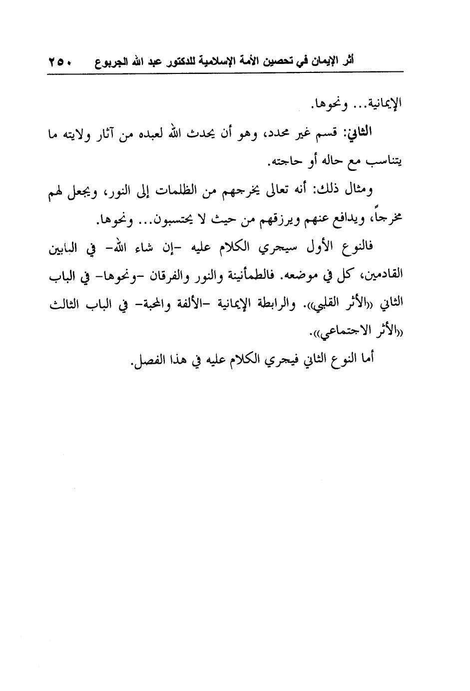 فالنوع الأول سيجري الكلام عليه -إن شاء الله- في البابين القادمين، كل في موضعه. فالطمأنينة والنور والفرقان -ونحوها- في الباب الثاني الأثر القلبي. والرابطة الإيمانية -الألفة والمحبة- في الباب الثالث الأثر الاجتماعي.