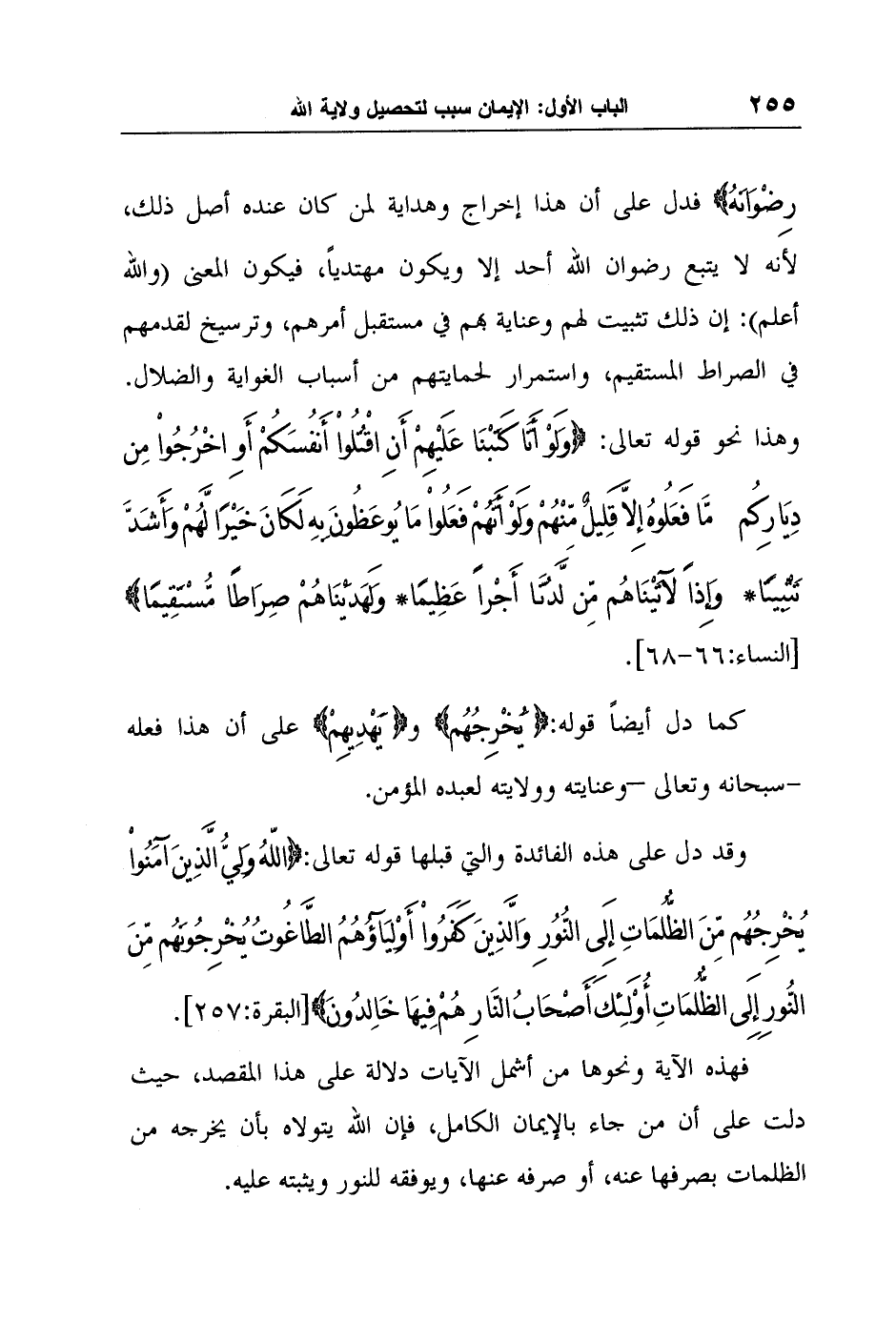 فهذه الآية ونحوها من أشمل الآيات دلالة على هذا المقصد، حيث دلت على أن من جاء بالإيمان الكامل، فإن الله يتولاه بأن يخرجه من الظلمات بصرفها عنه، أو صرفه عنها، ويوفقه للنور ويثبته عليه.